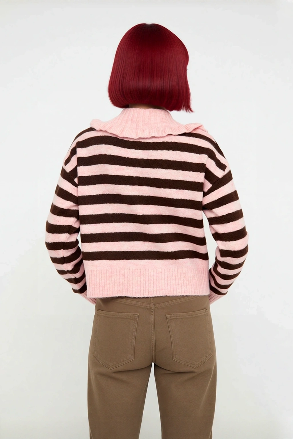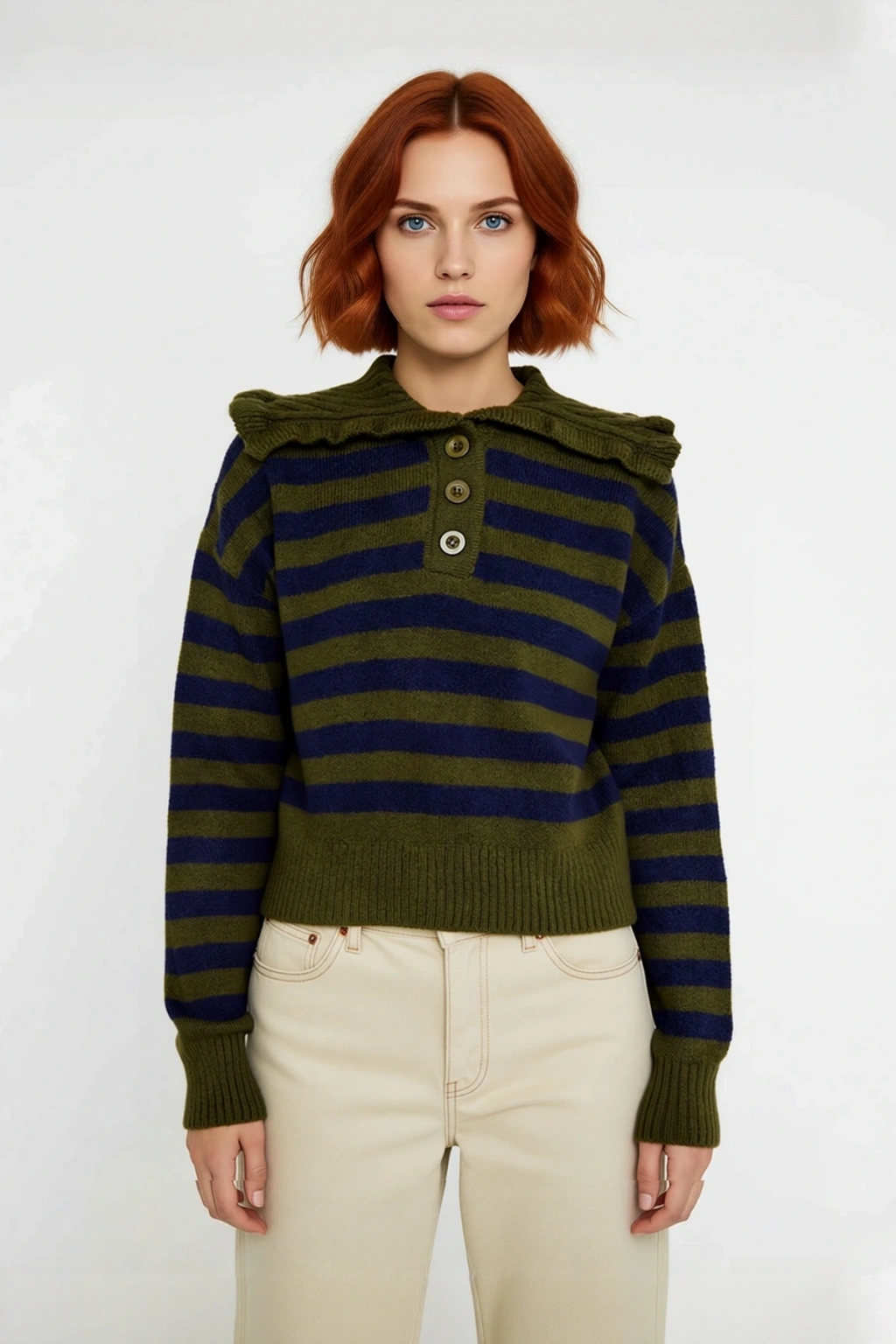 Ürün Özellikleri: Regular kalıp, %74 akrilik %26 polyester materyal, çizgili desen, devrik yaka, düşük kol, triko kumaş, haki renk, crop boy.