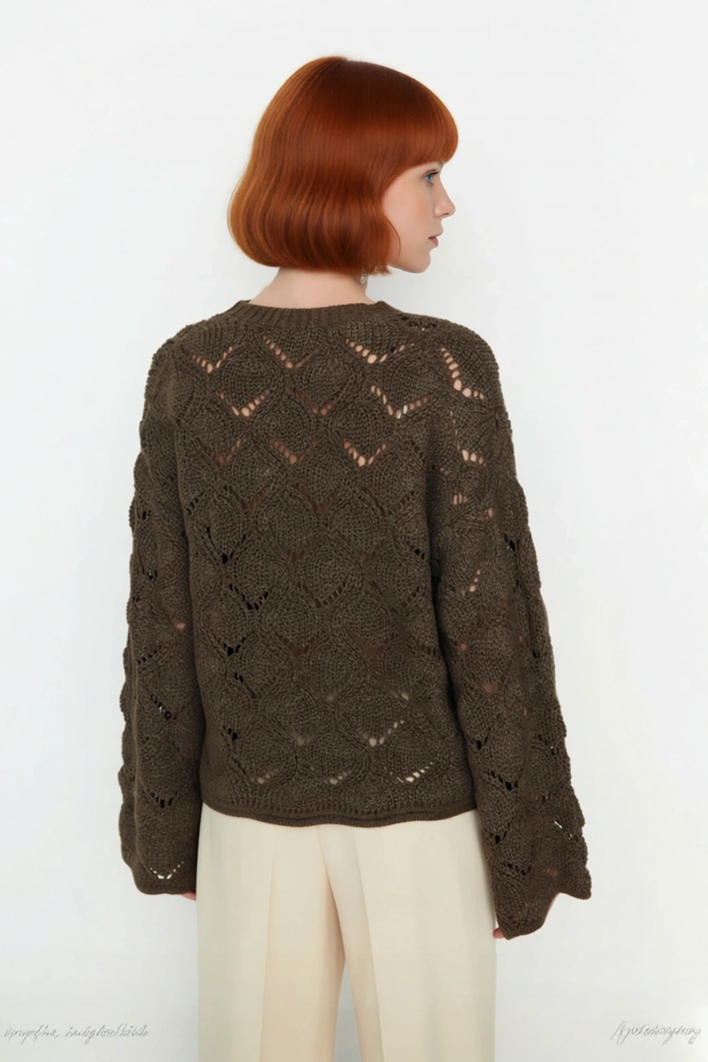 Ürün Özellikleri: Oversize kalıp, akrilik materyal, ajurlu desen, bisiklet yaka, İspanyol kol, triko kumaş, ekru renk.
