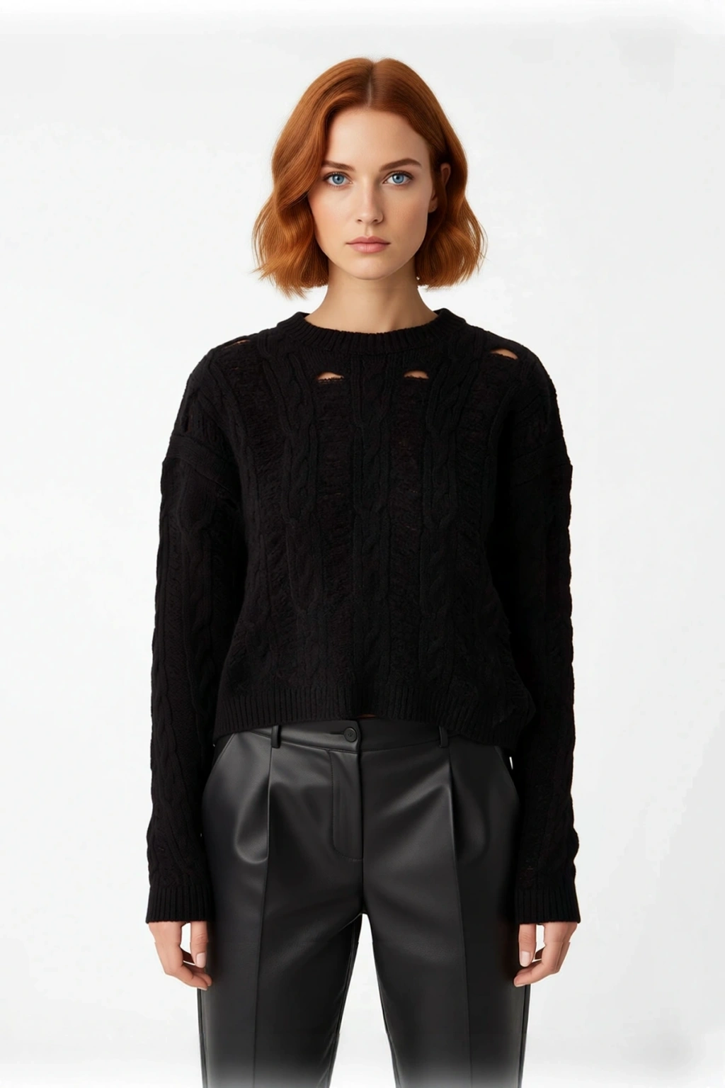 Ürün Özellikleri: Oversize kalıp, akrilik polyester materyal, ajurlu desen, bisiklet yaka, düşük kol, triko kumaş, siyah renk, crop boy.