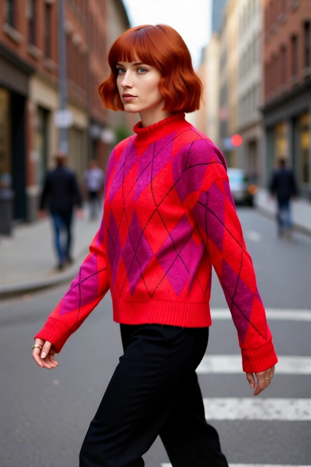 Bu göz alıcı triko kazak, oversize kalıbı ile rahatlığı ve şıklığı bir araya getirir. 80% akrilik ve 20% polyester karışımı materyali sayesinde yumuşacık bir dokunuş sunarken, soğuk kış günlerinde sizi sıcacık tutar. Canlı kırmızı ve mor tonlarındaki baklava deseni modern ve dinamik bir stil yansıtır. Günlük kombinlerinizde enerjik bir hava katmak isteyen kadınlar için ideal bir seçimdir. Kalınlığı orta seviyede olup, konforlu bir kullanım deneyimi sunar.