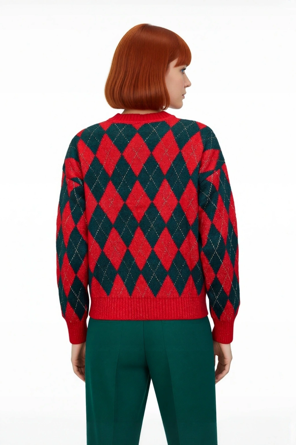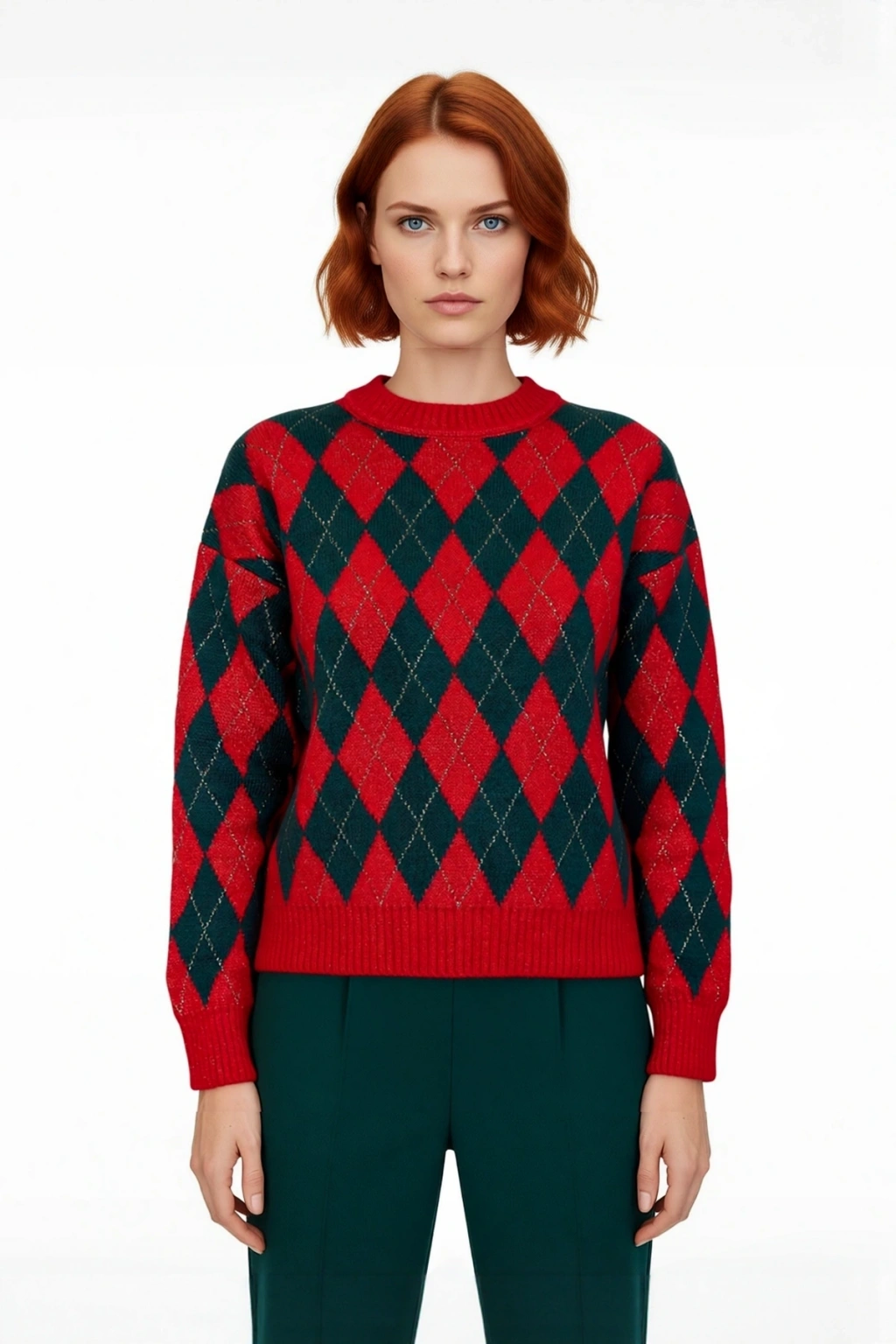 Ürün Özellikleri: Oversize kalıp, akrilik polyester metalize iplik, baklava desen, bisiklet yaka, düşük kol, triko kumaş, kırmızı yeşil simli.