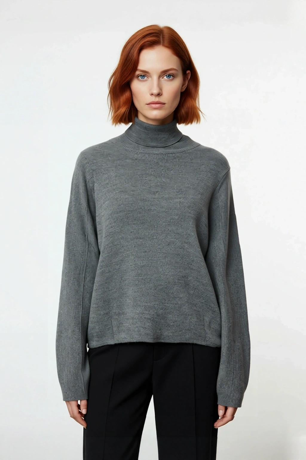 Ürün Özellikleri: Oversize kalıp, akrilik materyal, düz desen, balıkçı yaka, standart kol, triko kumaş, gri renk.