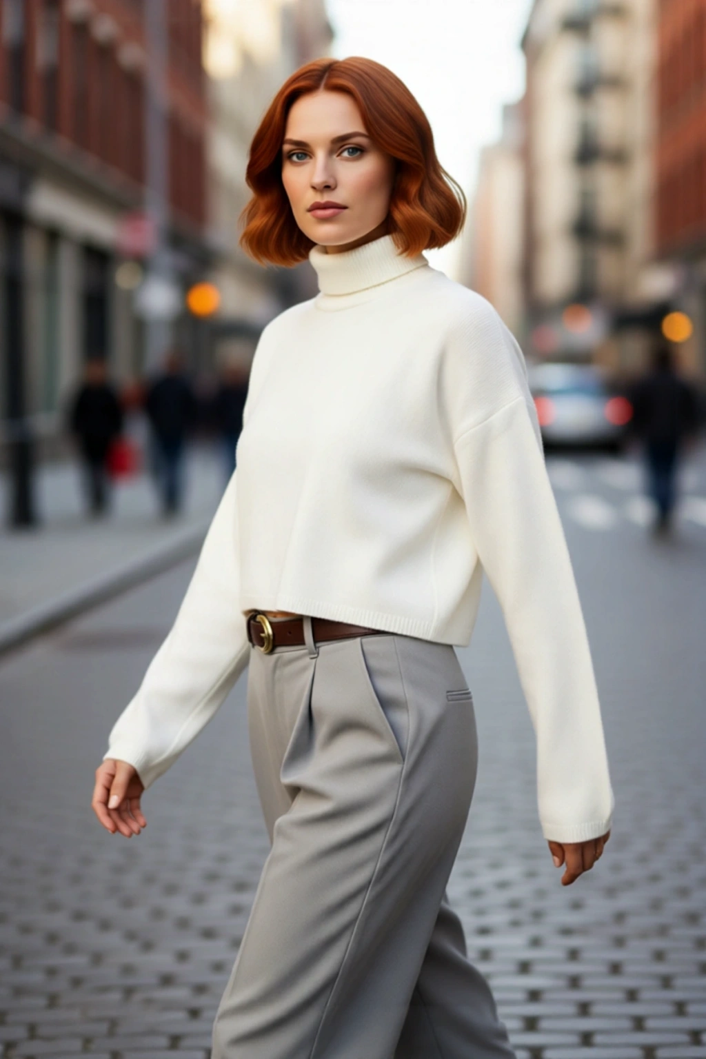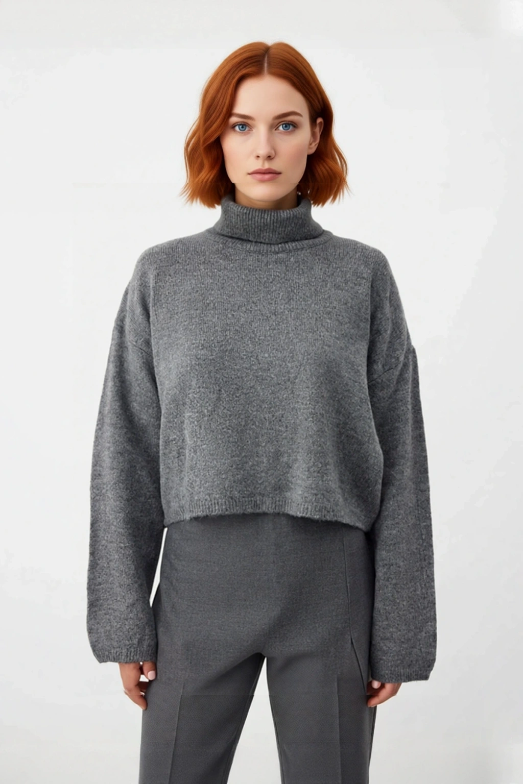 Ürün Özellikleri: Oversize kalıp, akrilik polyester materyal, düz desen, balıkçı yaka, düşük kol, triko kumaş, gri renk, super crop boy.