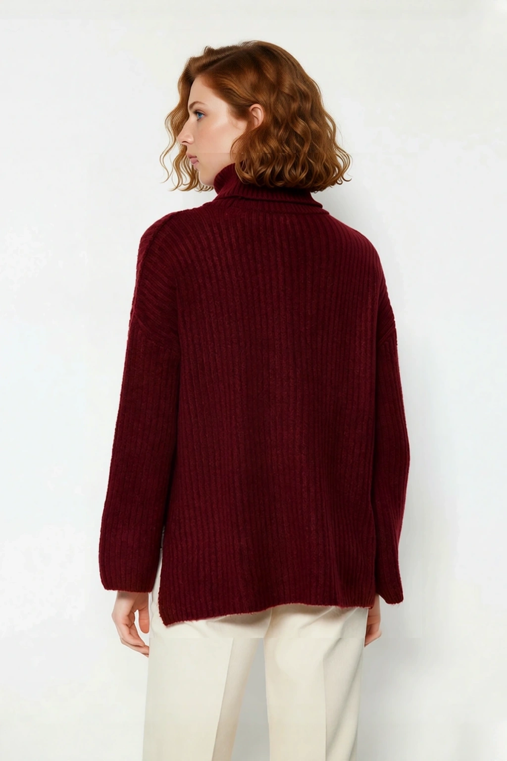 Ürün Özellikleri: Oversize kalıp, akrilik & polyester materyal, düz desen, balıkçı yaka, düşük kol, triko kumaş, bordo renk, baskısız tasarım.