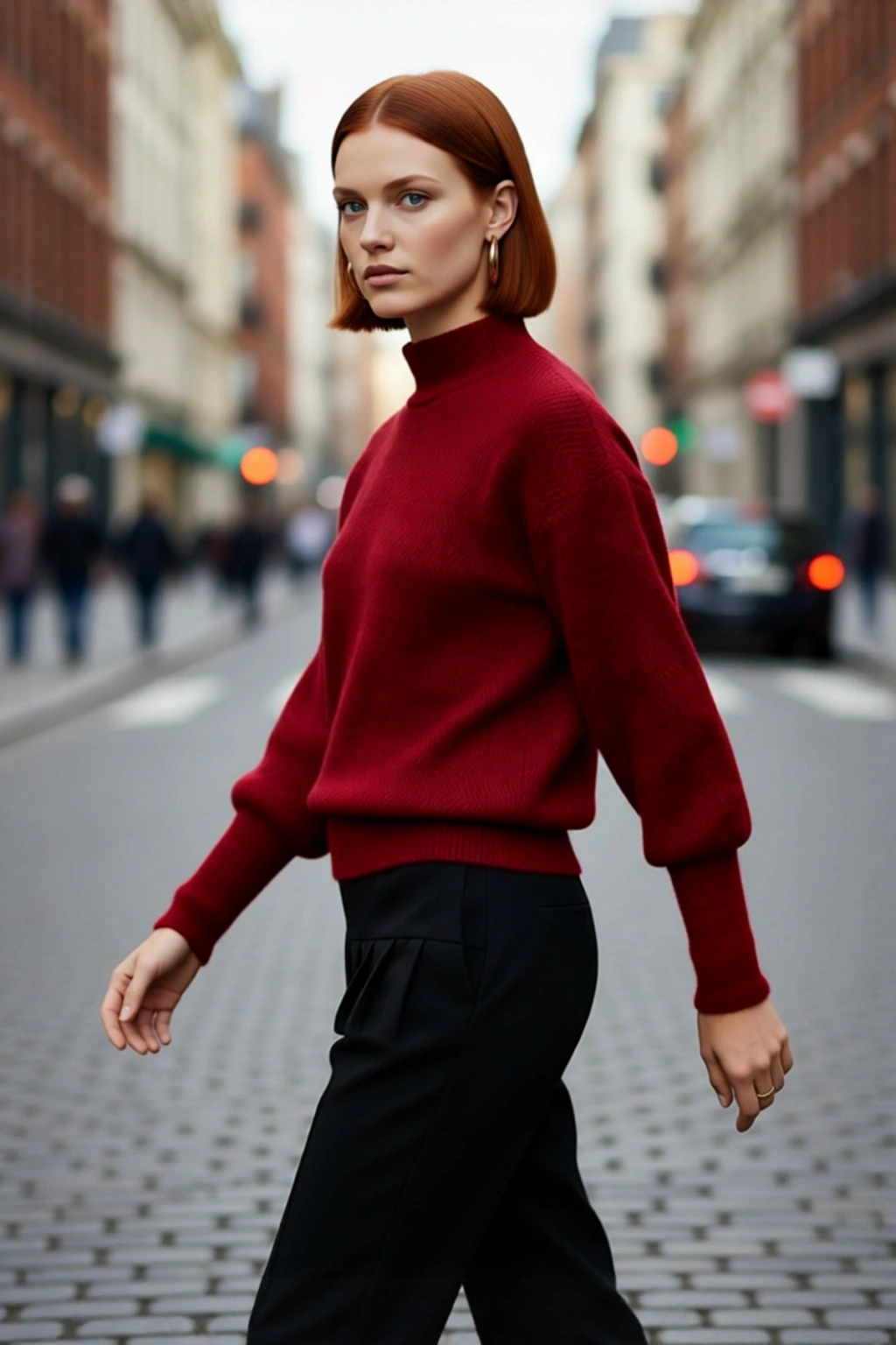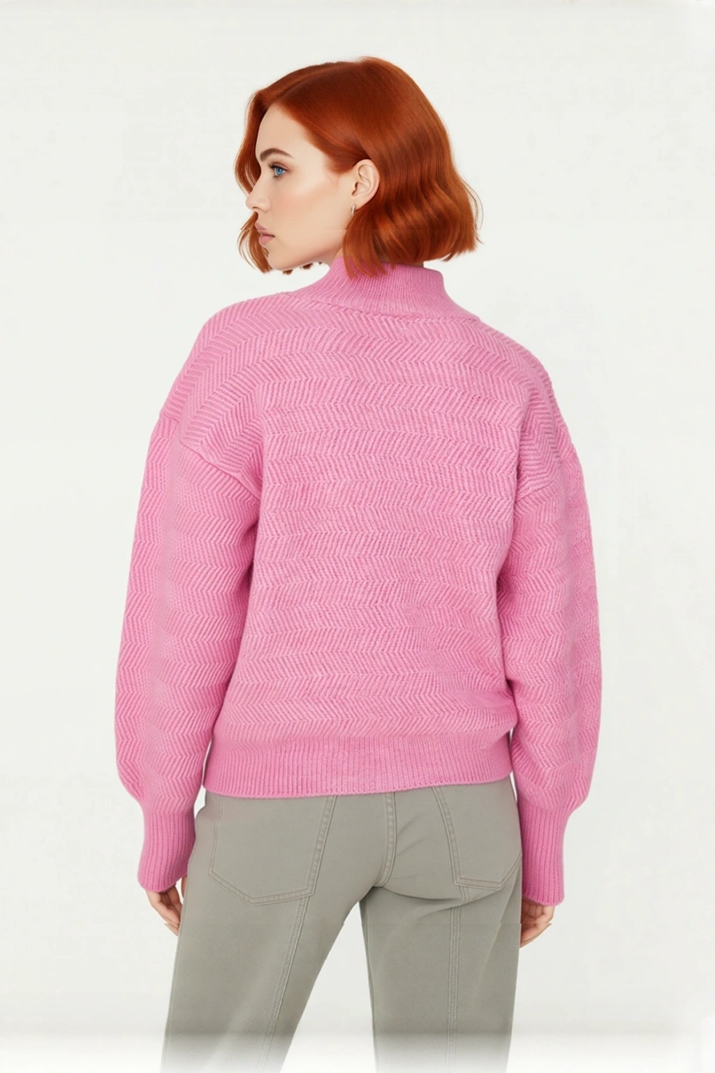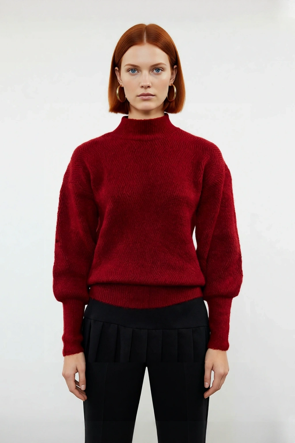 Ürün Özellikleri: Oversize kalıp, 79% Akrilik 21% Polyester materyal, zigzag desen, dik yaka, balon kol, triko kumaş, bordo renk, baskısız tasarım.