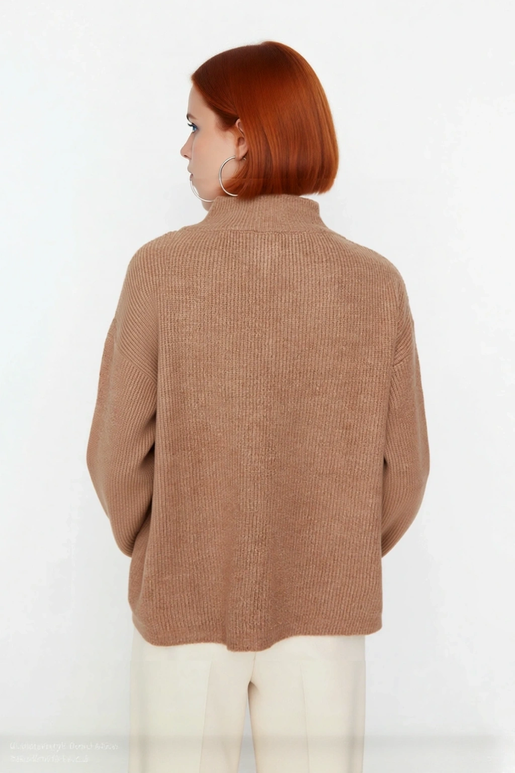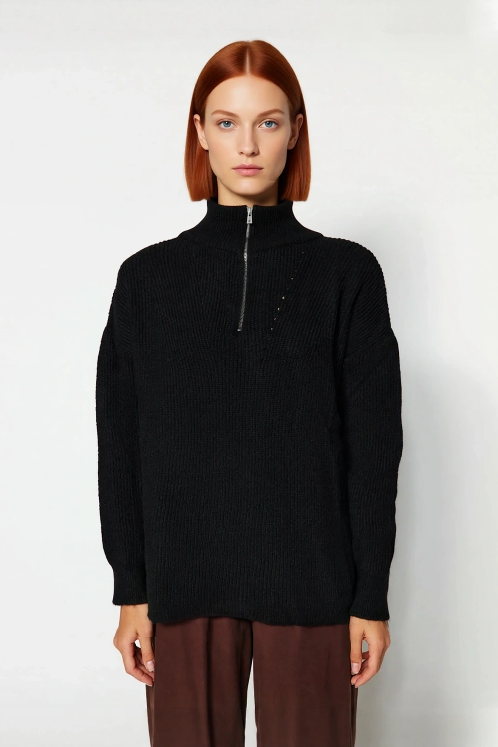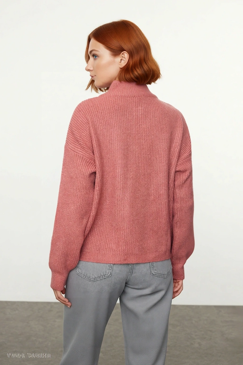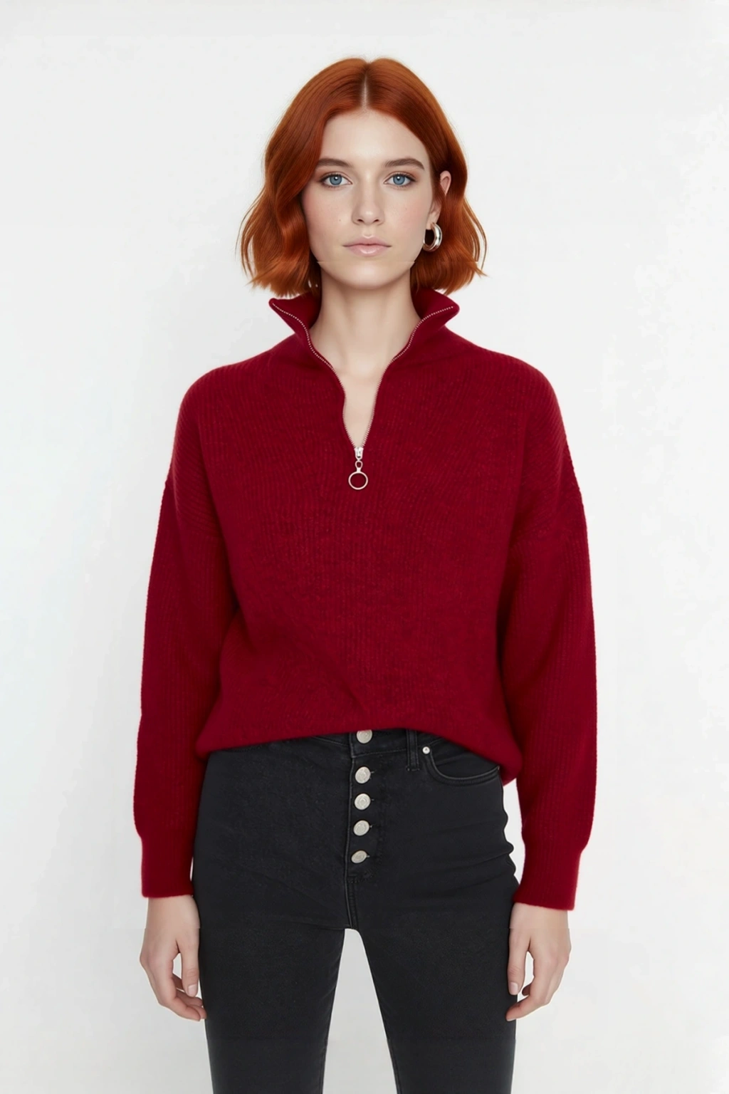 Ürün Özellikleri: Oversize kalıp, akrilik ve polyester materyal, düz desen, dik yaka, düşük kol, triko kumaş, bordo renk.