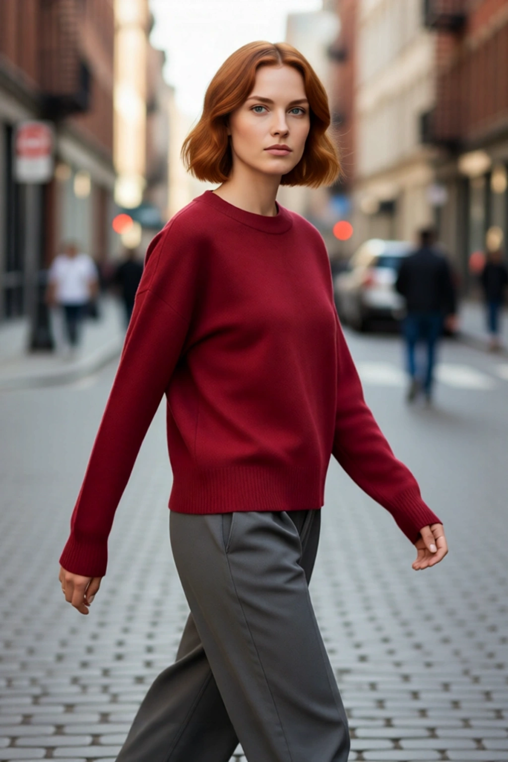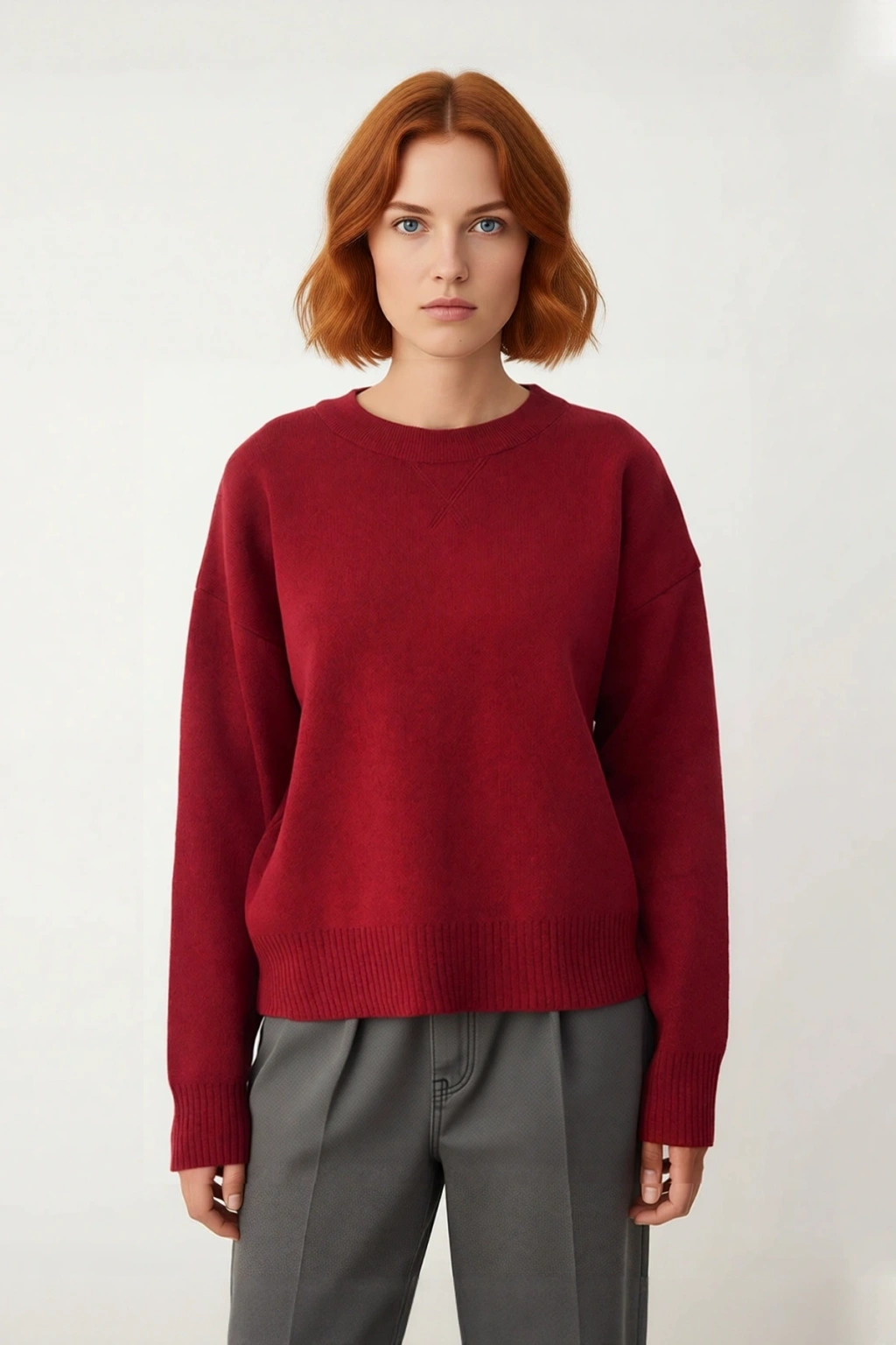Ürün Özellikleri: Oversize kalıp, akrilik/polyester/viskoz materyal, düz desen, bisiklet yaka, düşük uzun kol, triko kumaş, koyu kırmızı renk.