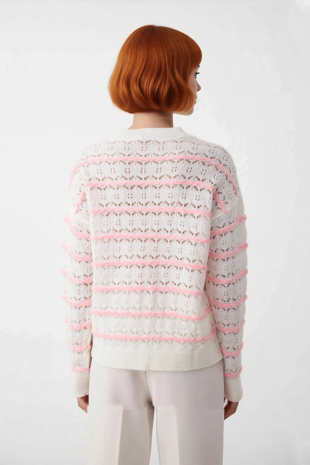 Ürün Özellikleri: Oversize kalıp, akrilik-polyester materyal, ajurlu çizgili desen, bisiklet yaka, düşük kol, triko kumaş, ekru-pembe renk, baskısız tasarım.