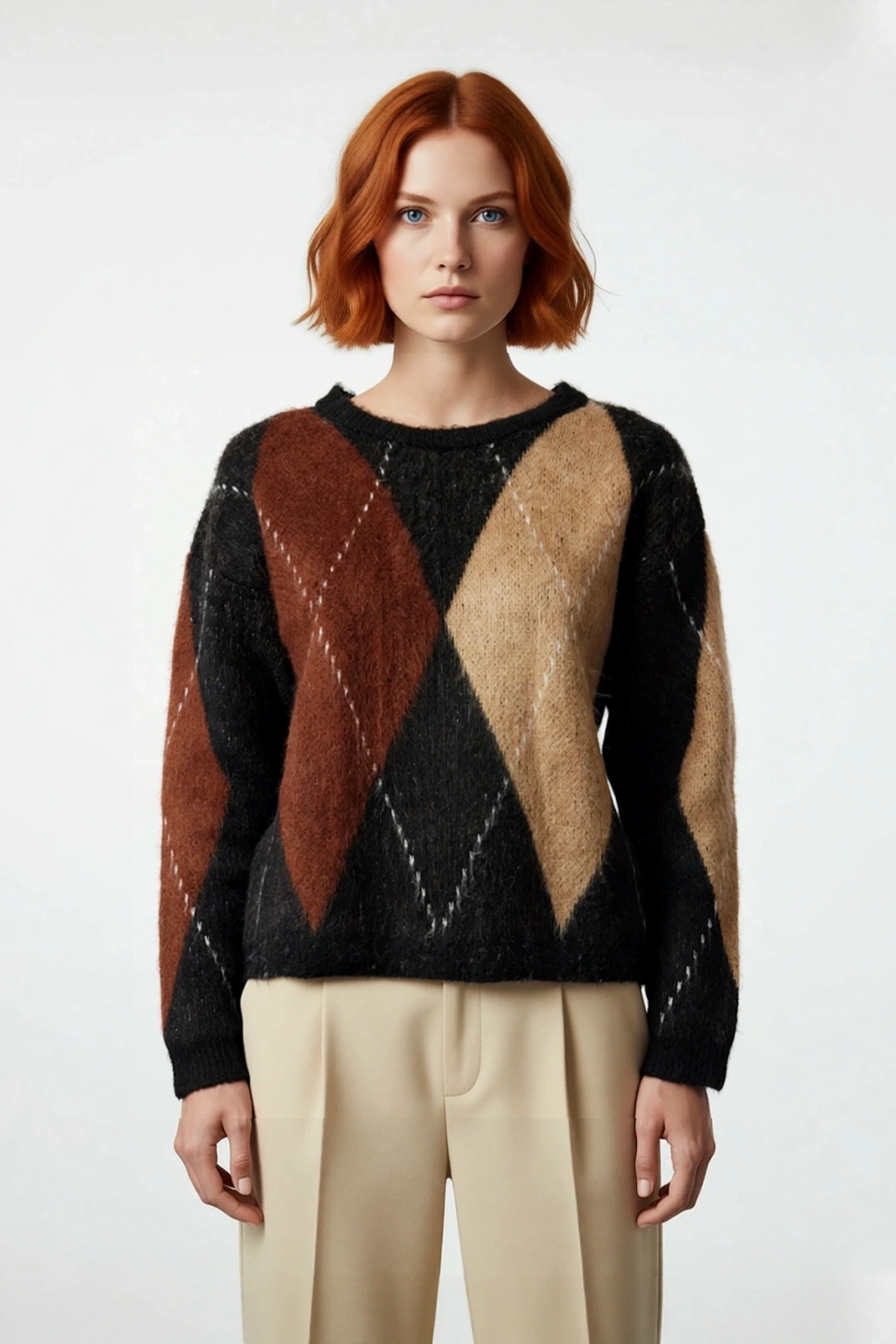Bu eşsiz kadın kazak, oversize kalıbı ile modern ve rahat bir siluet sunar. Yüksek kaliteli akrilik ve polyester karışımı materyali sayesinde yumuşacık bir dokunuş hissi verirken kış aylarının soğuğuna karşı mükemmel koruma sağlar. Baklava deseni, siyah kahve ve bej renk bloklarıyla dinamik ve şık bir görünüm oluşturur. Hem rahatlığı hem de stil sahibi olmayı arayan kadınlar için ideal bir seçenek olup, casual ve günlük ortamlar için tasarlanmıştır. Cool ve comfort bir duruş sergileyen bu triko kazak, kış gardırobunuzun vazgeçilmezi olacak.