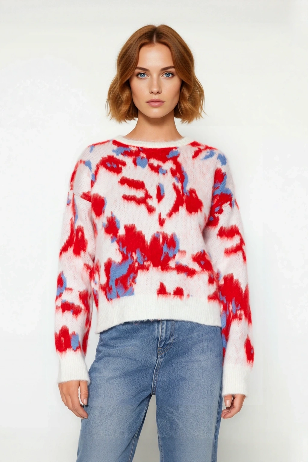 Bu Kadın Oversize Bisiklet Yaka Batik Desenli Düşük Kol Akrilik Triko Kazak, modern ve özgün tarzıyla gardırobunuzun vazgeçilmezi olacak. Oversize kalıbı sayesinde gün boyu eşsiz bir konfor ve hareket özgürlüğü sunarken, yüksek kaliteli akrilik materyali soğuk havalarda bile sizi sıcacık tutar. Batik deseni, enerjik ve dinamik bir görünüm kazandırırken, ekru zemin üzerindeki canlı kırmızı ve sakin mavi tonlarındaki geçişler dikkat çekici ve sanatsal bir stil yaratır. Bu kazak, rahatlığı ve şıklığı bir arada arayan modern kadınlar için ideal bir seçimdir. Cepsiz tasarımı sade ve minimalist bir estetik sunarak şıklığınızı tamamlar.