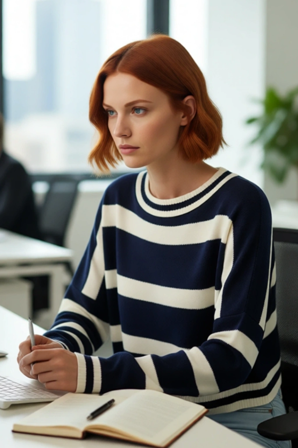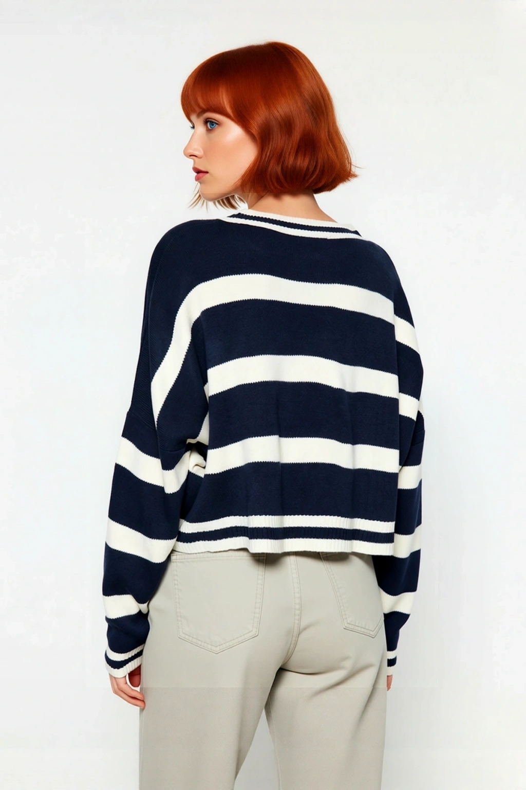 Bu şık Kadın Oversize Bisiklet Yaka Çizgili Triko Crop Kazak, modern ve rahat bir stil arayanların favorisi olacak. %100 akrilik materyali sayesinde gün boyu konfor sunarken, orta kalınlığı ile ilkbahar ve sonbahar mevsim geçişlerinin vazgeçilmezi haline gelir. Ekru zemin üzerine lacivert çizgili deseni, zamansız bir şıklık katarken, crop boyu ile dinamik ve genç bir görünüm yakalamak isteyen kadınlar için idealdir. Cool & Comfort persona tanımına uygun bu kazak, gardırobunuzun en kullanışlı parçalarından biri olacak.