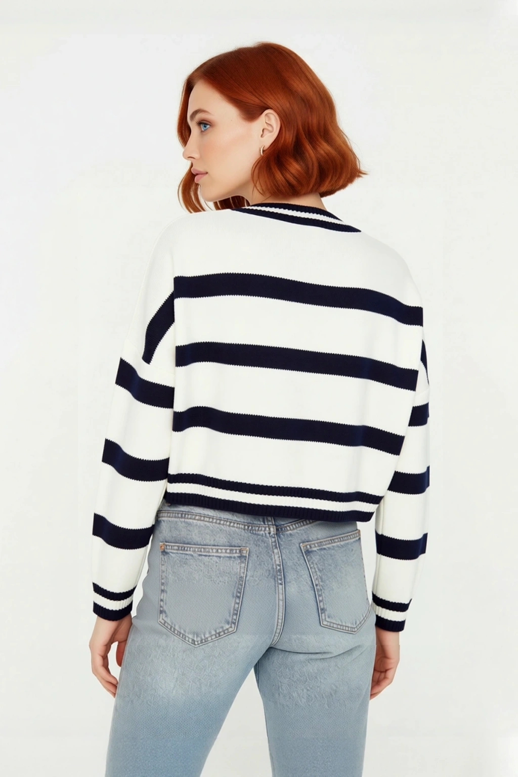 Ürün Özellikleri: Oversize kalıp, akrilik materyal, çizgili desen, bisiklet yaka, düşük kol, triko kumaş, ekru renk, baskısız tasarım.