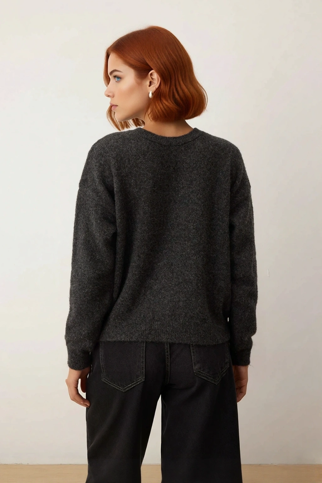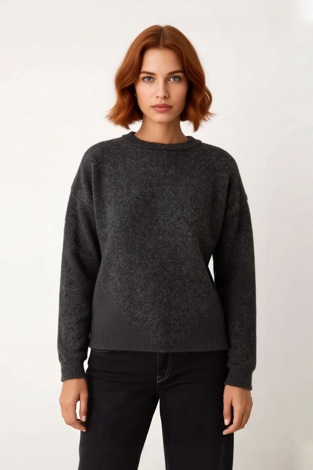 Ürün Özellikleri: Oversize kalıp, polyester akrilik yün karışımlı materyal, düz desen, bisiklet yaka, düşük kol, triko kumaş, gri renk.