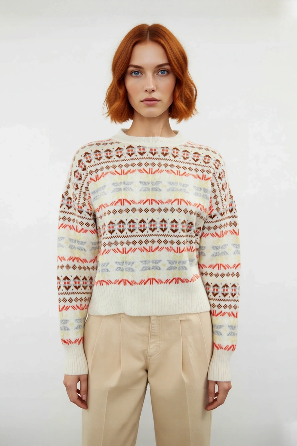 Kadınlara özel tasarlanmış bu oversize bisiklet yaka etnik desen triko kazak, soğuk kış günlerinde bile stilinizden taviz vermeden sıcak ve şık kalmak isteyenler için idealdir. Rahat ve geniş oversize kalıbı, gün boyu süren konfor sunarken, modern ve salaş bir estetik yaratır. Zengin etnik desenleri, kazağa özgün bir karakter ve sanatsal bir dokunuş katarken, kahverengi rengi her kombine kolayca uyum sağlar. Orta kalınlıktaki triko kumaşı, teninize nazikçe dokunur ve "Cool & Comfort" hissini her an yaşatır. Casual ve günlük giyim için biçilmiş kaftan olan bu kazak, kış gardırobunuzun yıldız parçası olacak.
