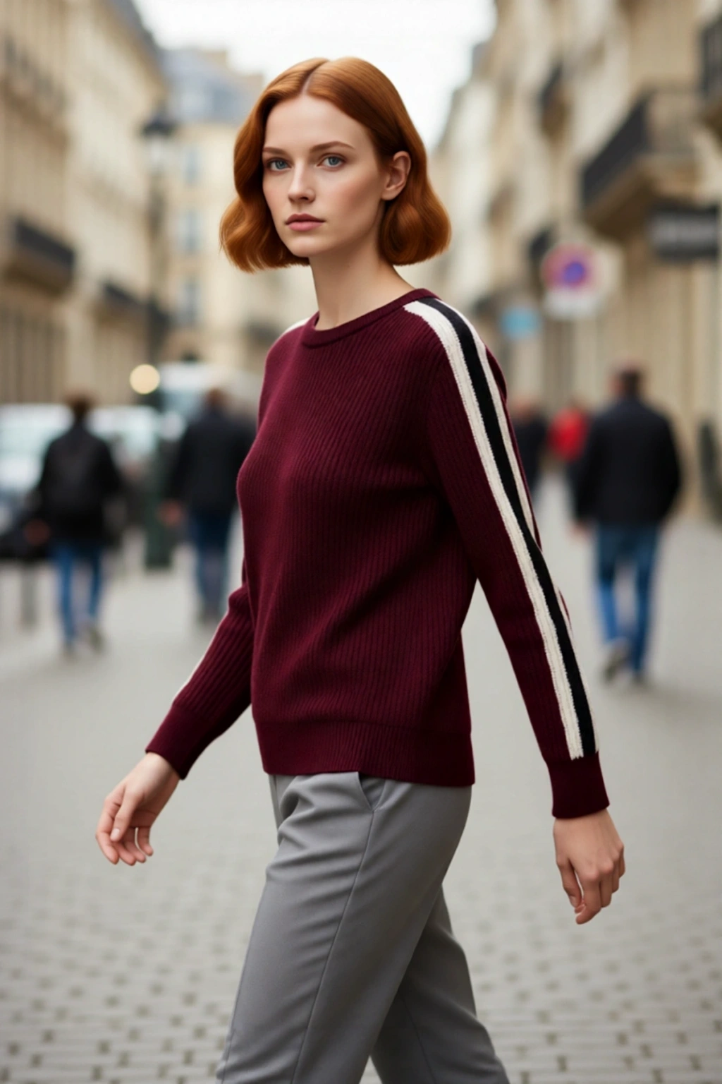 Ürün Özellikleri: Oversize kalıp, akrilik karışımlı materyal, renk bloklu desen, bisiklet yaka, reglan kol, triko kumaş, bordo renk, Selanik dokuma.