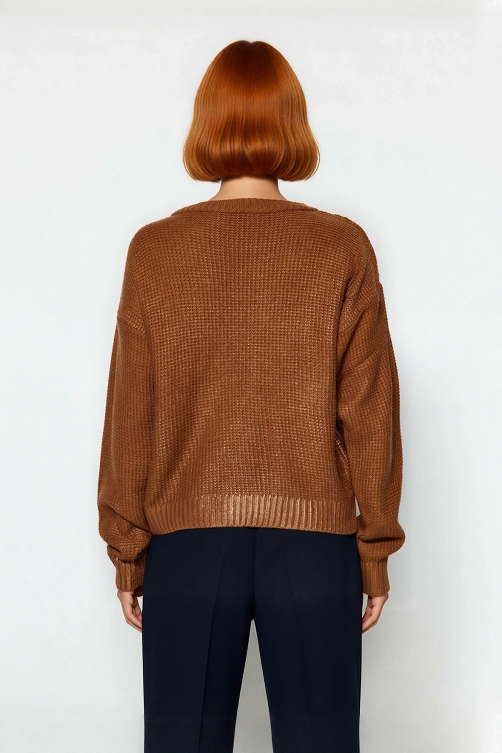 Ürün Özellikleri: Oversize kalıp, akrilik materyal, varak baskılı desen, bisiklet yaka, düşük kol, triko kumaş, kahverengi renk.