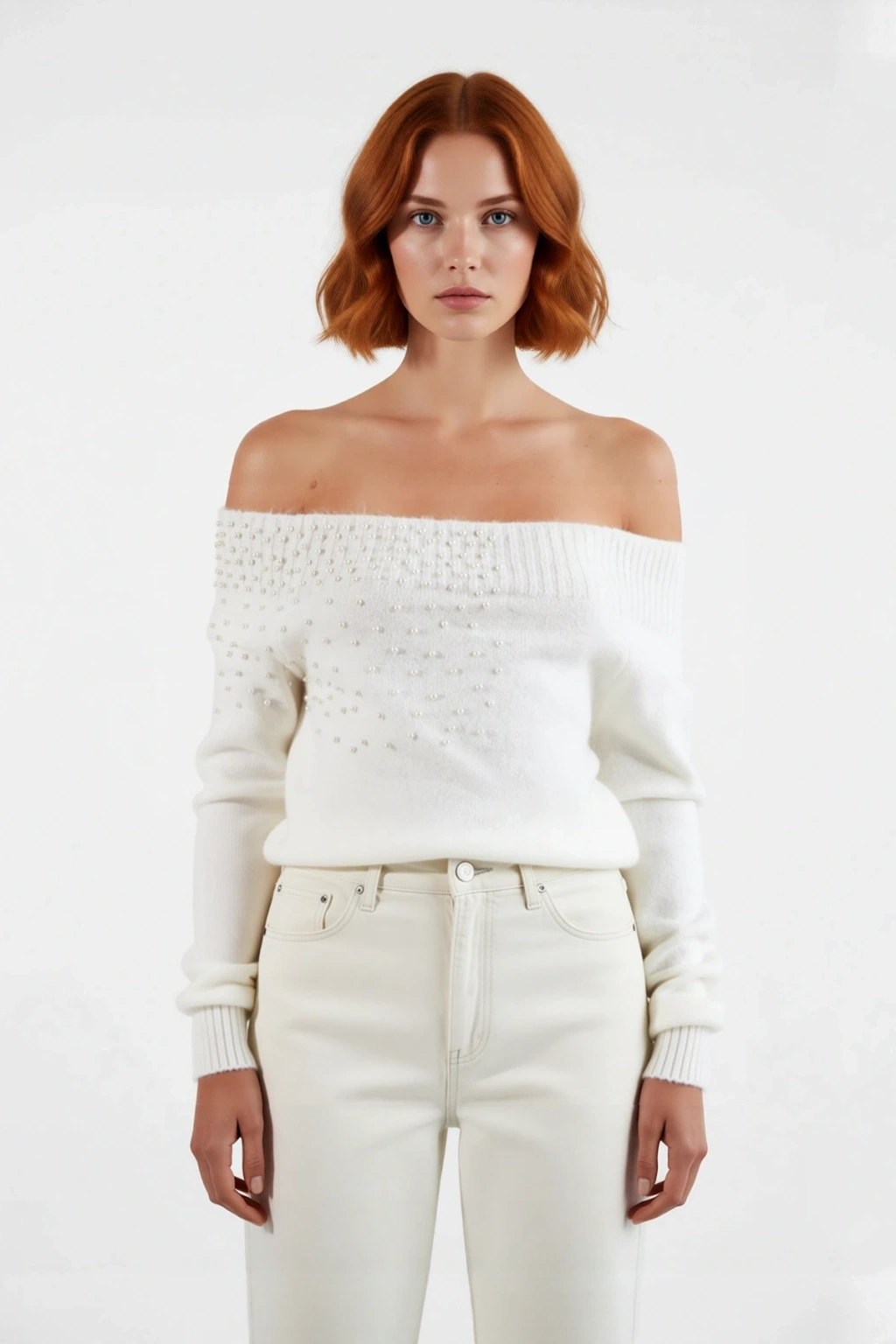 Bu modern kadın triko kazak, oversize kalıbı ile rahatlığı ve şıklığı bir arada sunar. Yumuşak dokusu sayesinde gün boyu konfor sağlarken, yüksek kaliteli akrilik ve polyester karışımı materyali soğuk havalarda sizi sıcak tutar. Kayık yaka tasarımı omuzları zarifçe açıkta bırakarak çekici bir görünüm katarken, boncuk işlemeli detaylar kazaka ışıltılı ve sofistike bir hava katar. Ekru rengi, her türlü kombinle uyum sağlayarak gardırobunuzun vazgeçilmez parçası olmaya adaydır. Düz deseni, boncuk işlemelerinin ön plana çıkmasını sağlar.