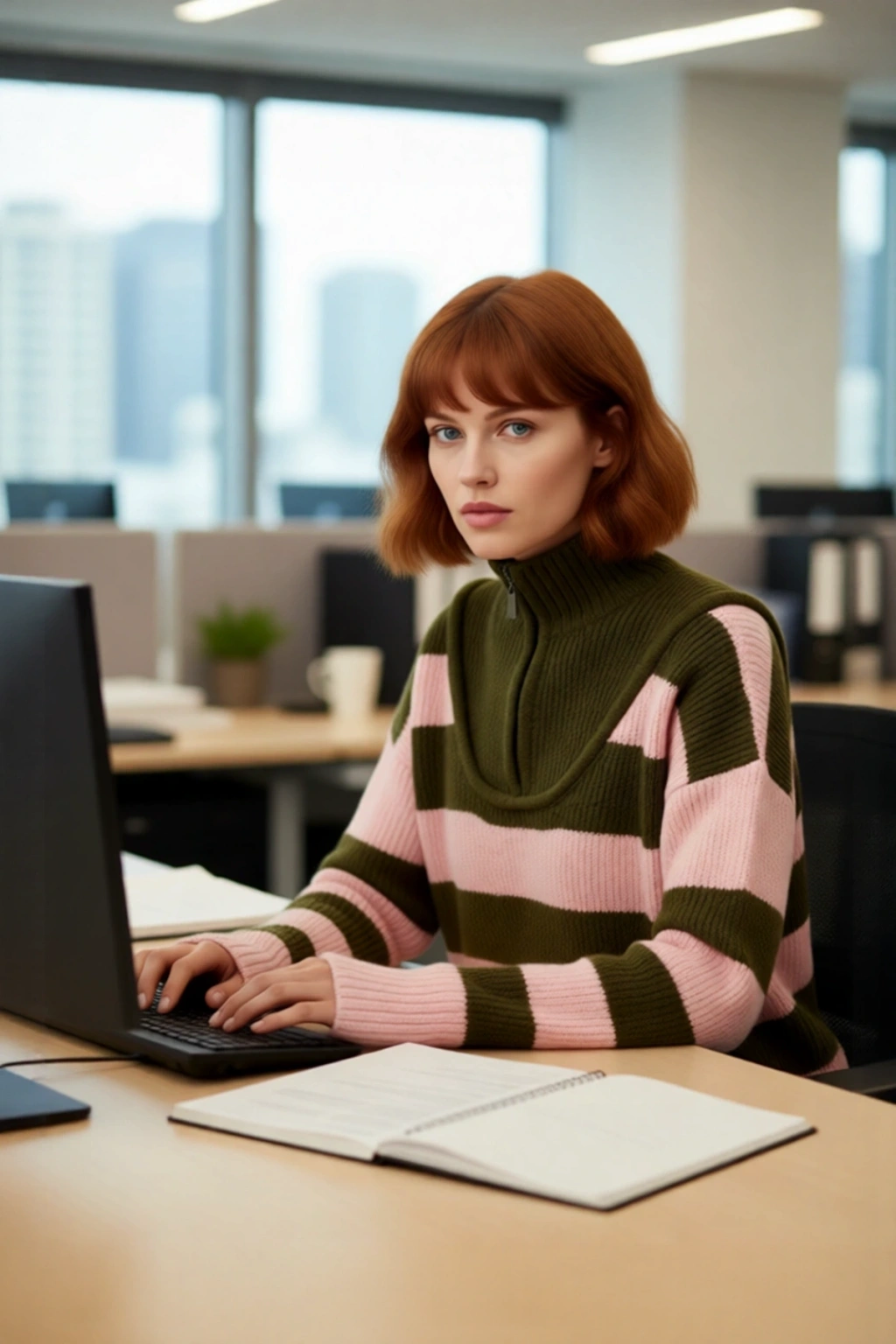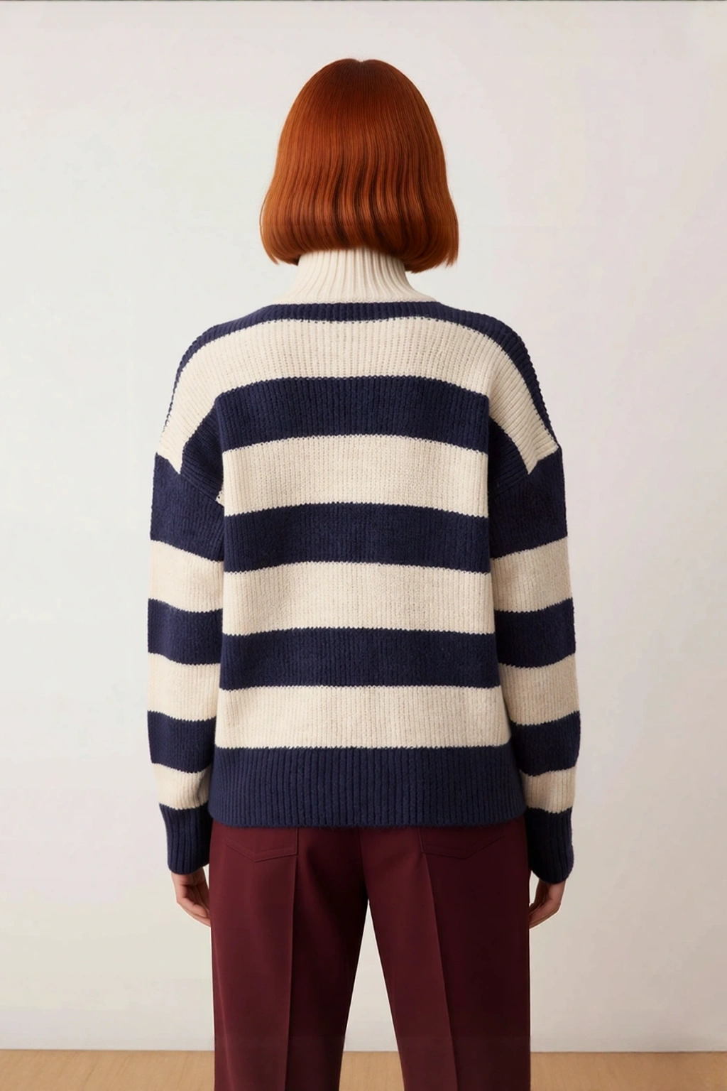 Ürün Özellikleri: Oversize kalıp, akrilik polyester materyal, çizgili desen, dik yaka, düşük kol, triko kumaş, haki pembe renk, selanik dokuma.