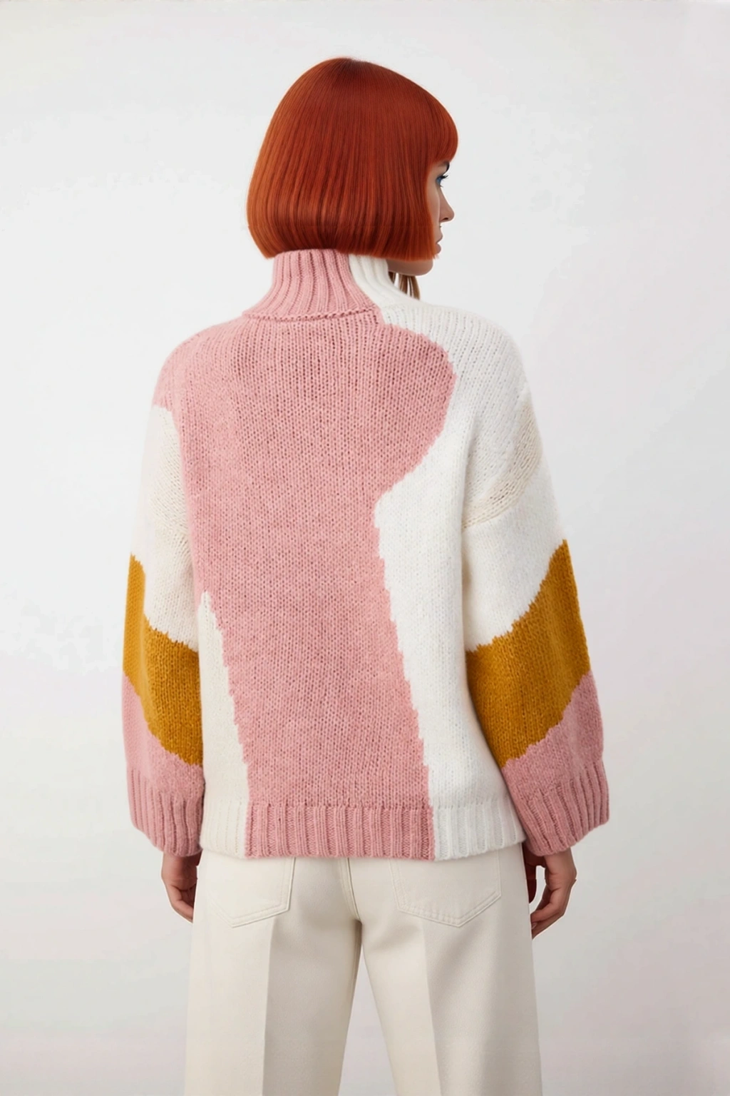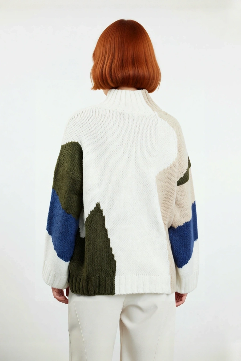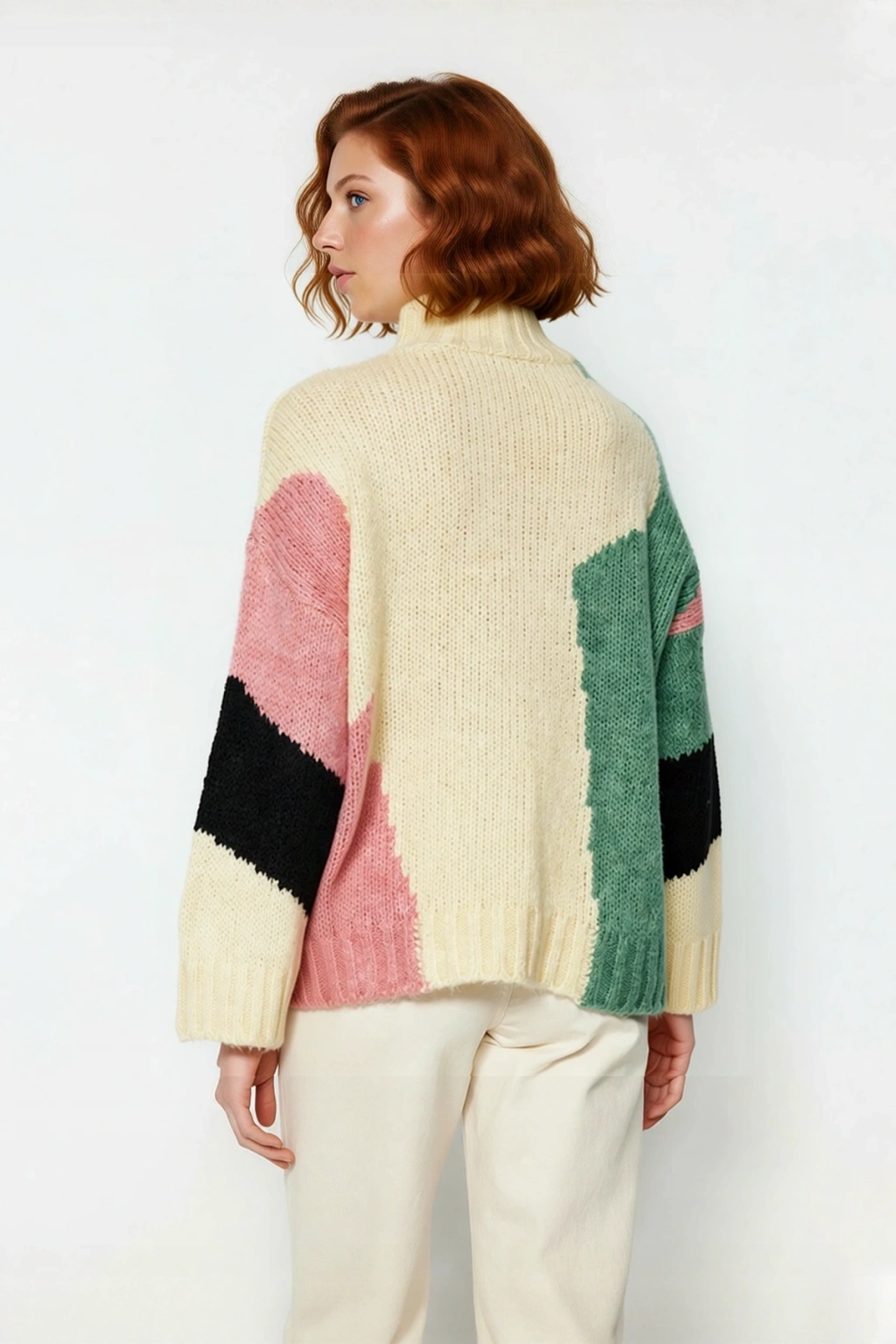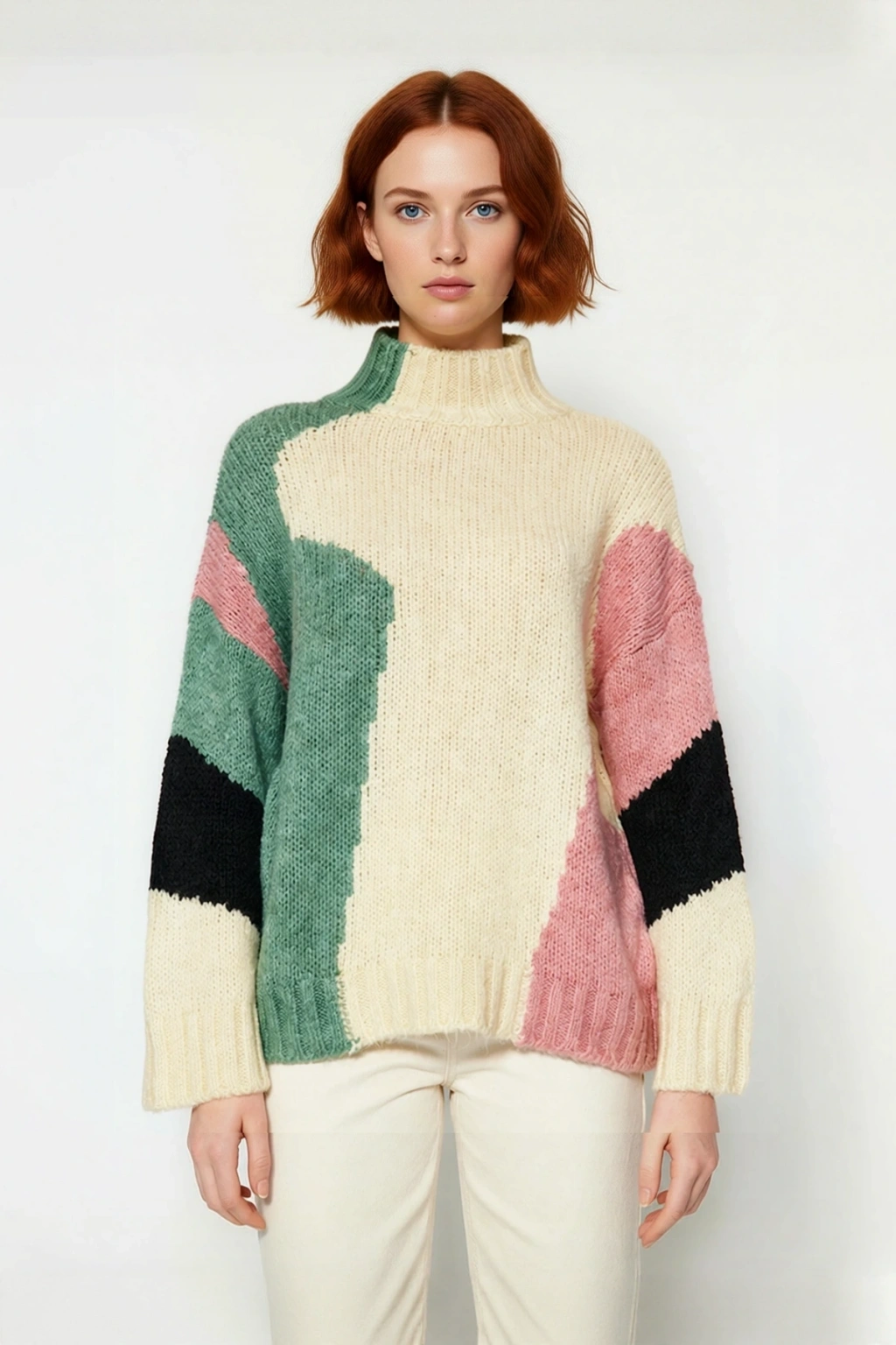 Ürün Özellikleri: Oversize kalıp, 75% Akrilik 22% Polyester 3% Elastan materyal, renk bloklu desen, dik yaka, düşük kol, triko kumaş, bej renk bloklu, basic siluet.