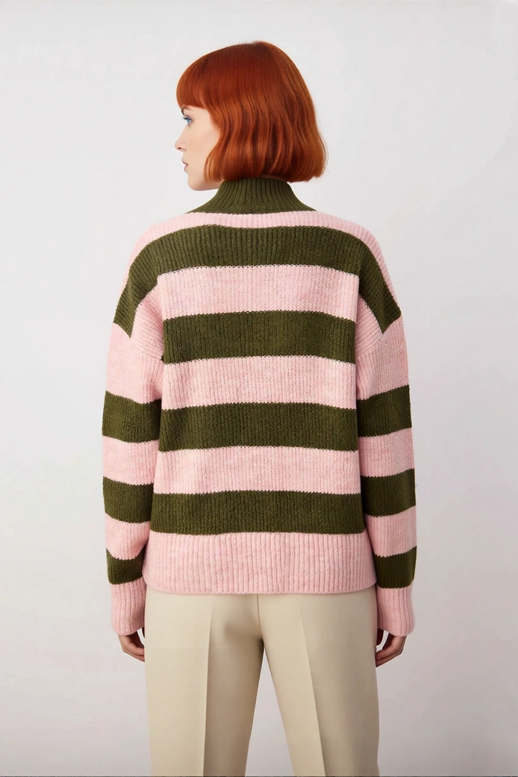 Ürün Özellikleri: Oversize kalıp, akrilik polyester materyal, çizgili desen, dik yaka, düşük kol, triko kumaş, haki pembe renk, selanik dokuma.