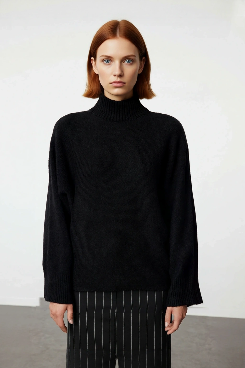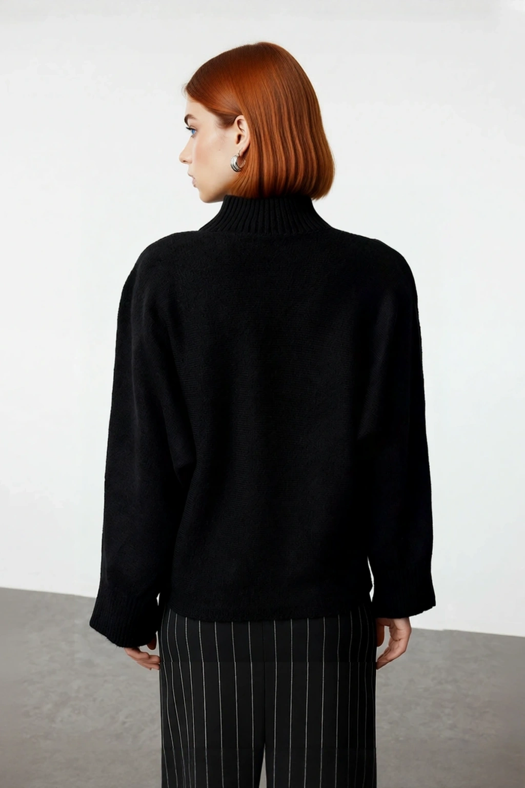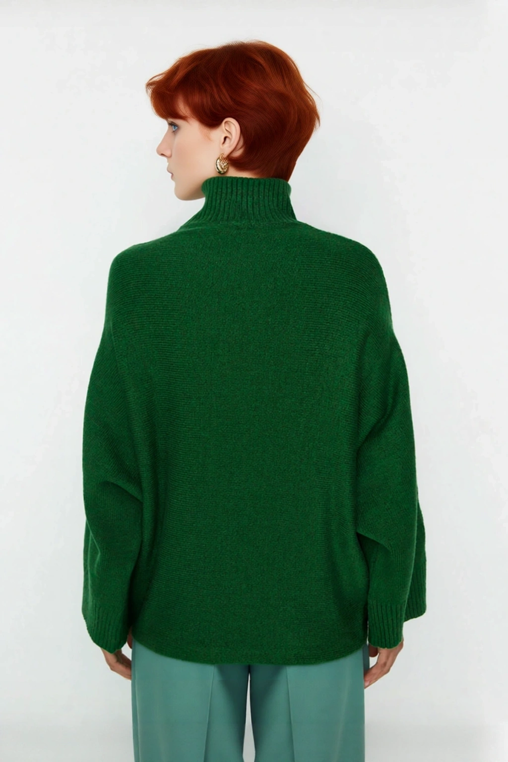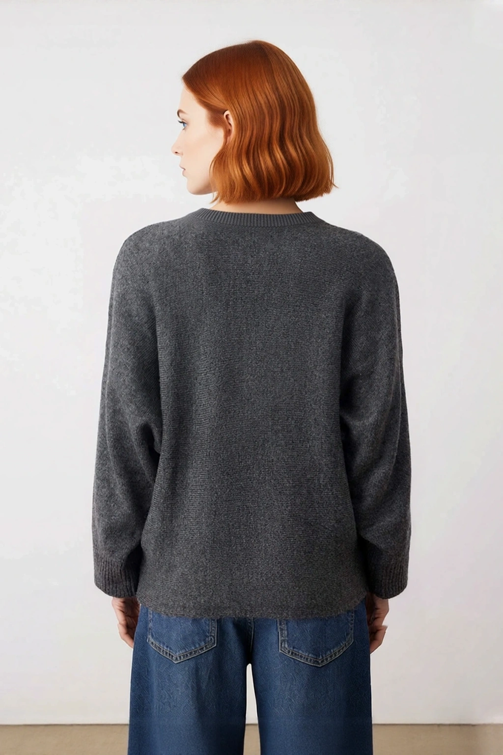 Ürün Özellikleri: Oversize kalıp, 75% Akrilik 25% Polyester materyal, düz desen, dik yaka, düşük kol, triko kumaş, gri renk.