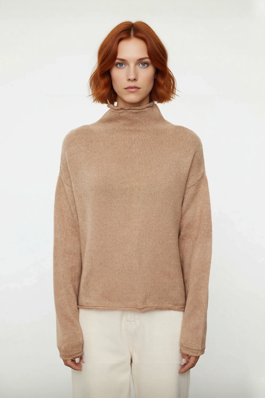 Ürün Özellikleri: Oversize kalıp, akrilik materyal, düz desen, dik yaka, uzun düşük kol, triko kumaş, bej renk, baskısız tasarım.