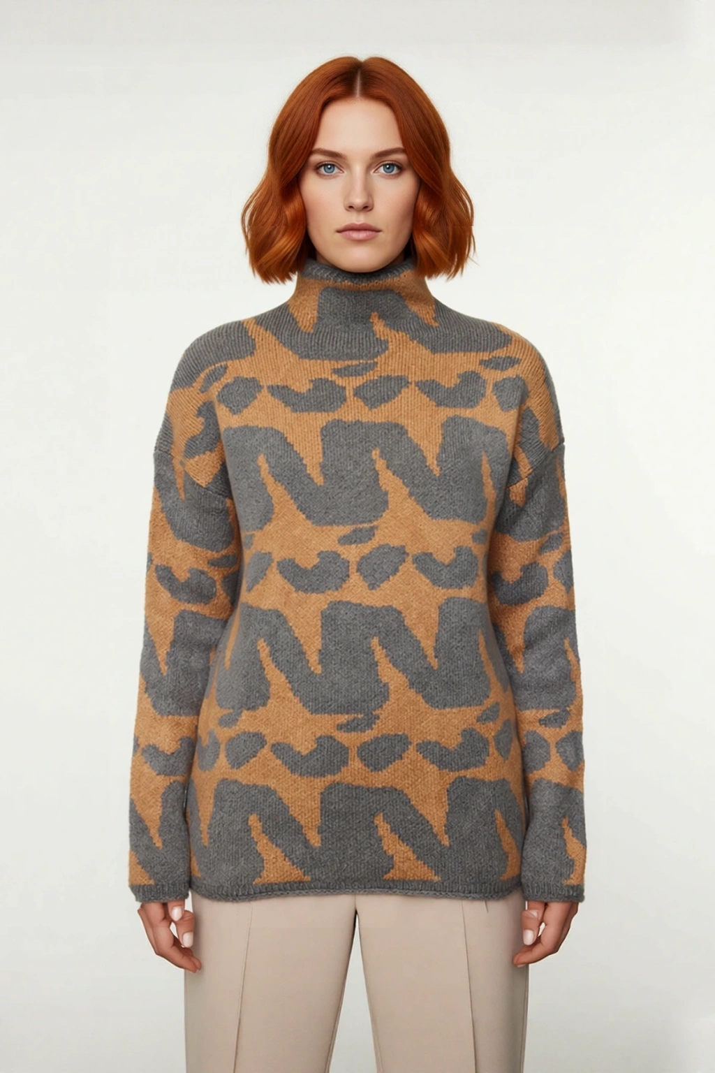 Bu modern Kadın Oversize Dik Yaka Triko Kazak, soğuk kış günlerinde stil ve konforu bir araya getiriyor. Rahat oversize kalıbı, hareket özgürlüğü sunarken gün boyu rahatlık vaat eder. Yüksek kaliteli %80 akrilik ve %20 polyester materyal bileşimi sayesinde yumuşacık bir dokunuş hissi vererek cildinizi nazikçe sarar ve sıcak tutar. Gri ve kahverengi tonlarındaki çarpıcı geometrik deseni, sıradanlıktan uzak, dinamik ve şık bir görünüm yaratır. Bu kazak, kişiliğinizi yansıtan "Cool & Comfort" persona ile her ortamda dikkat çekmenizi sağlayacak eşsiz bir parçadır. Baskısız tasarımı sayesinde desenin dokuma kalitesi ön plana çıkar.