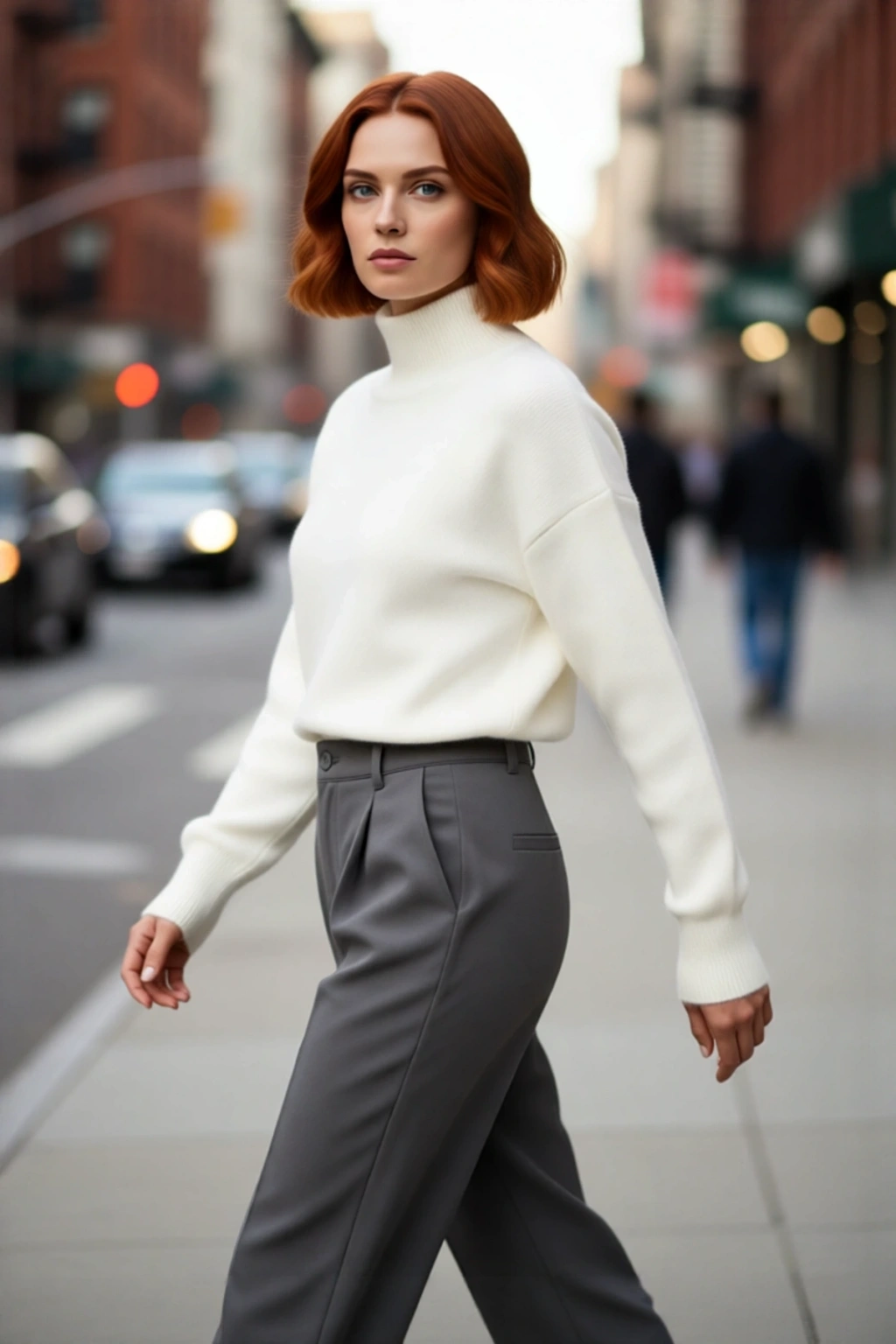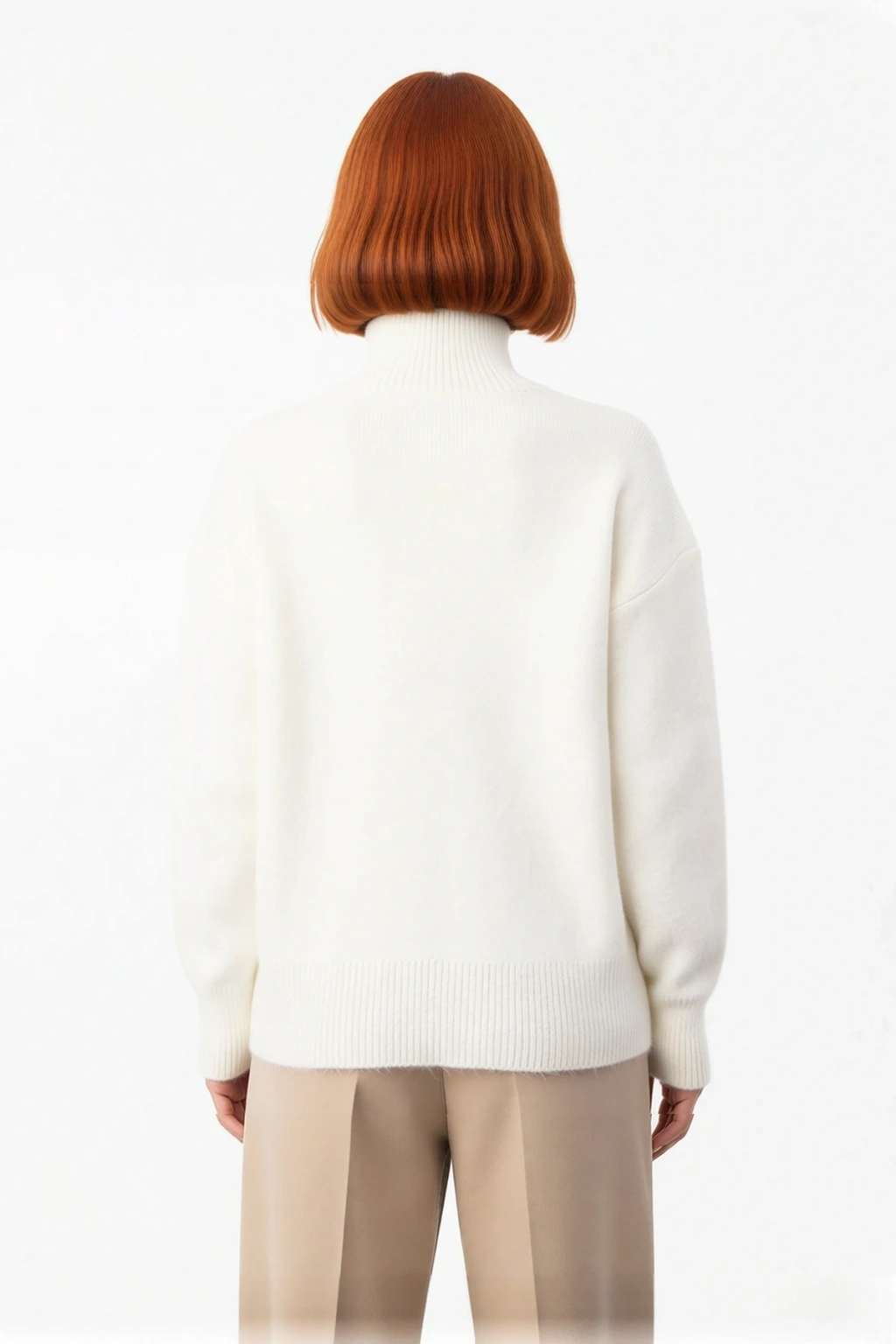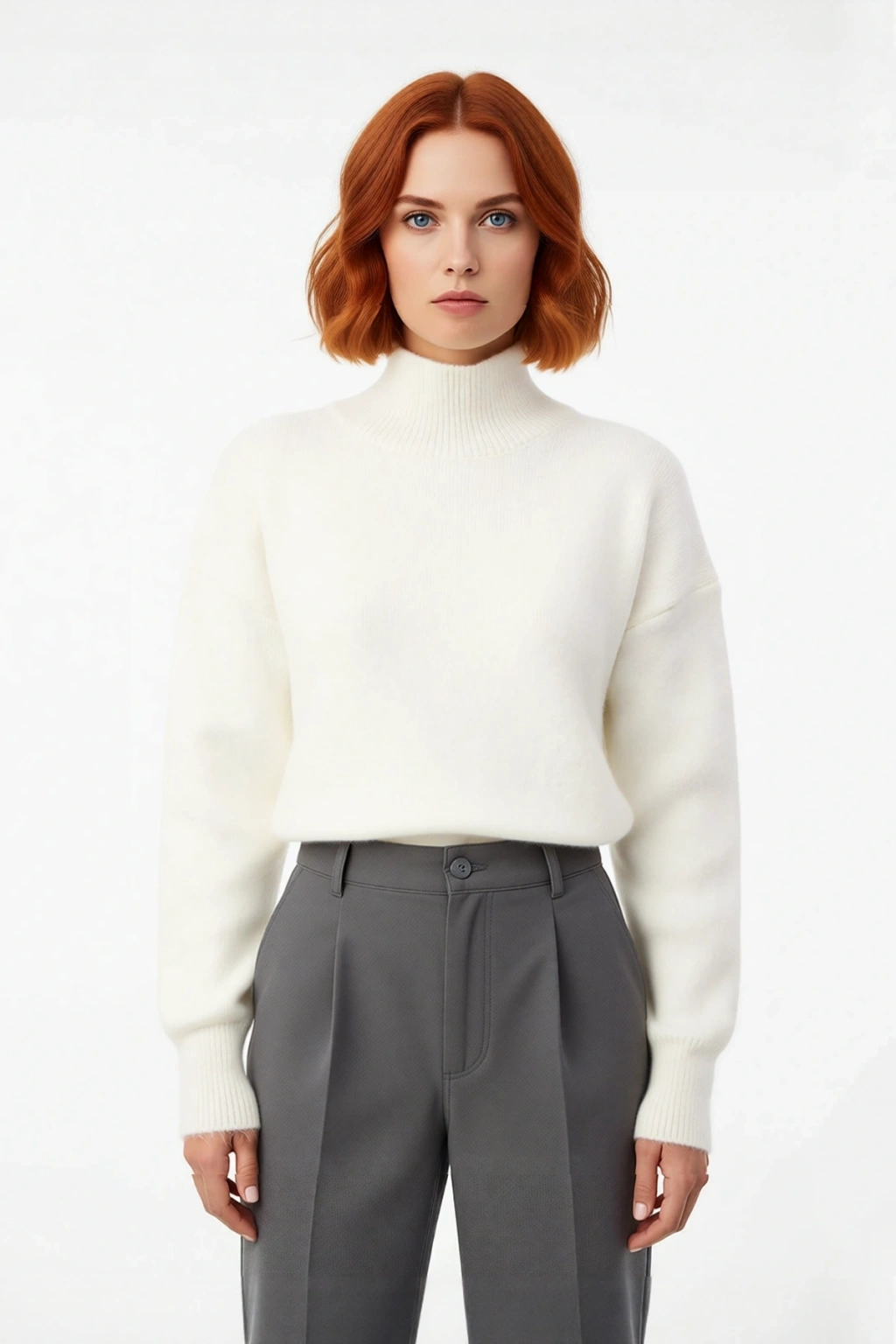 Ürün Özellikleri: Oversize kalıp, akrilik polyester yün karışımı materyal, düz desen, dik yaka, düşük kol, triko kumaş, ekru renk.