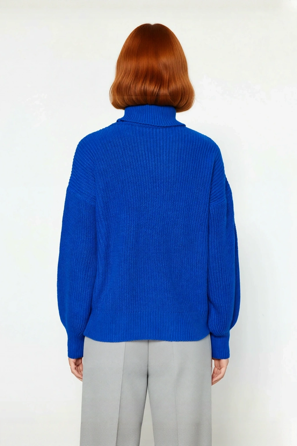Ürün Özellikleri: Oversize kalıp, %100 akrilik materyal, düz desen, balıkçı yaka, düşük kol, triko kumaş, canlı mavi renk, cepsiz tasarım.