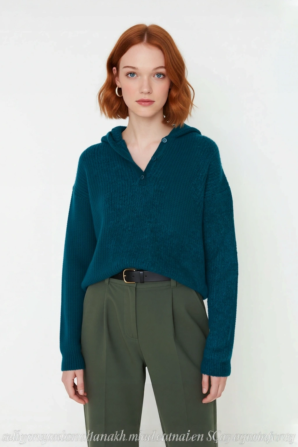 Ürün Özellikleri: Oversize kalıp, akrilik polyester materyal, düz desen, kapüşonlu yaka, düşük kol, triko kumaş, yeşil renk.