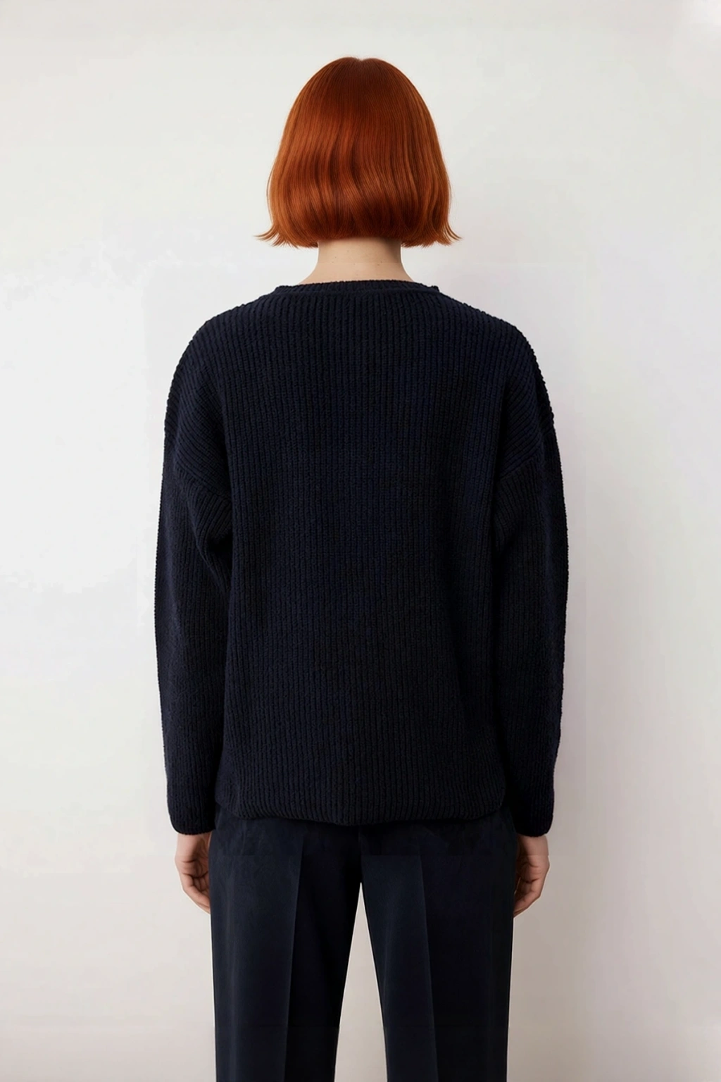 Ürün Özellikleri: Oversize kalıp, %53 polyester %47 pamuk materyal, düz desen, bisiklet yaka, düşük kol, triko kumaş, lacivert renk.