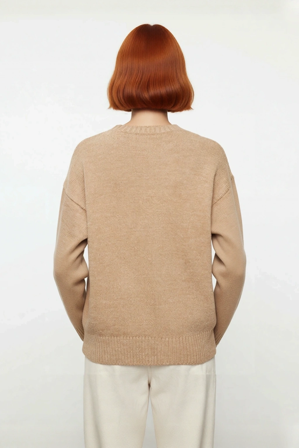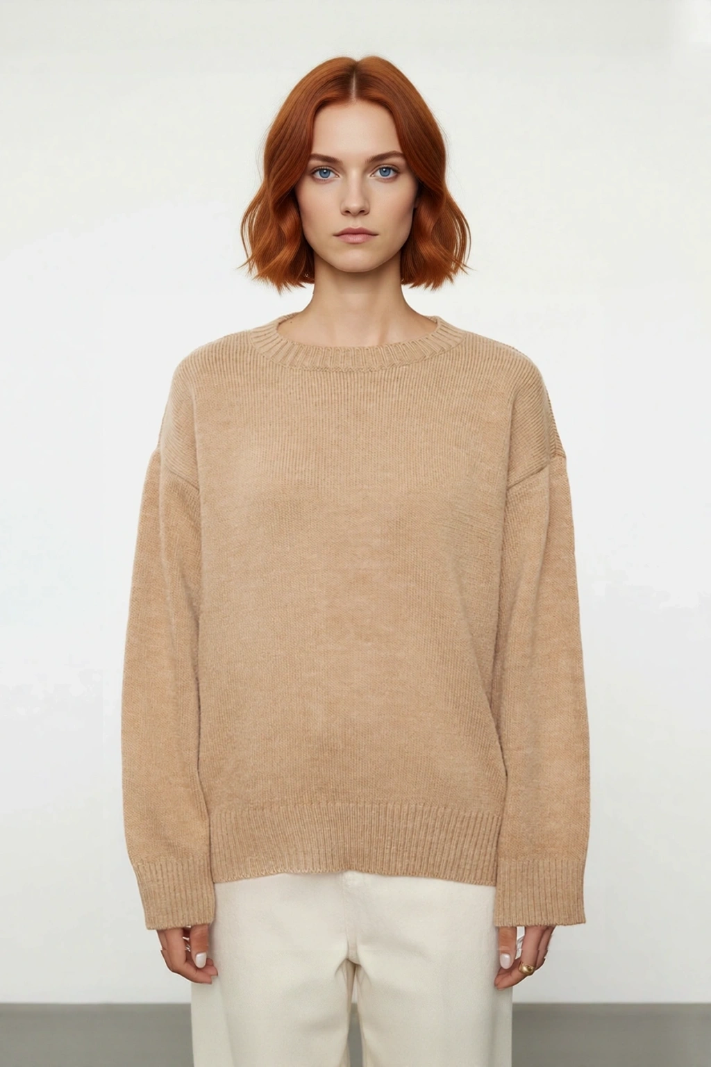 Ürün Özellikleri: Oversize kalıp, akrilik materyal, düz desen, bisiklet yaka, standart uzun kol, triko kumaş, bej renk.