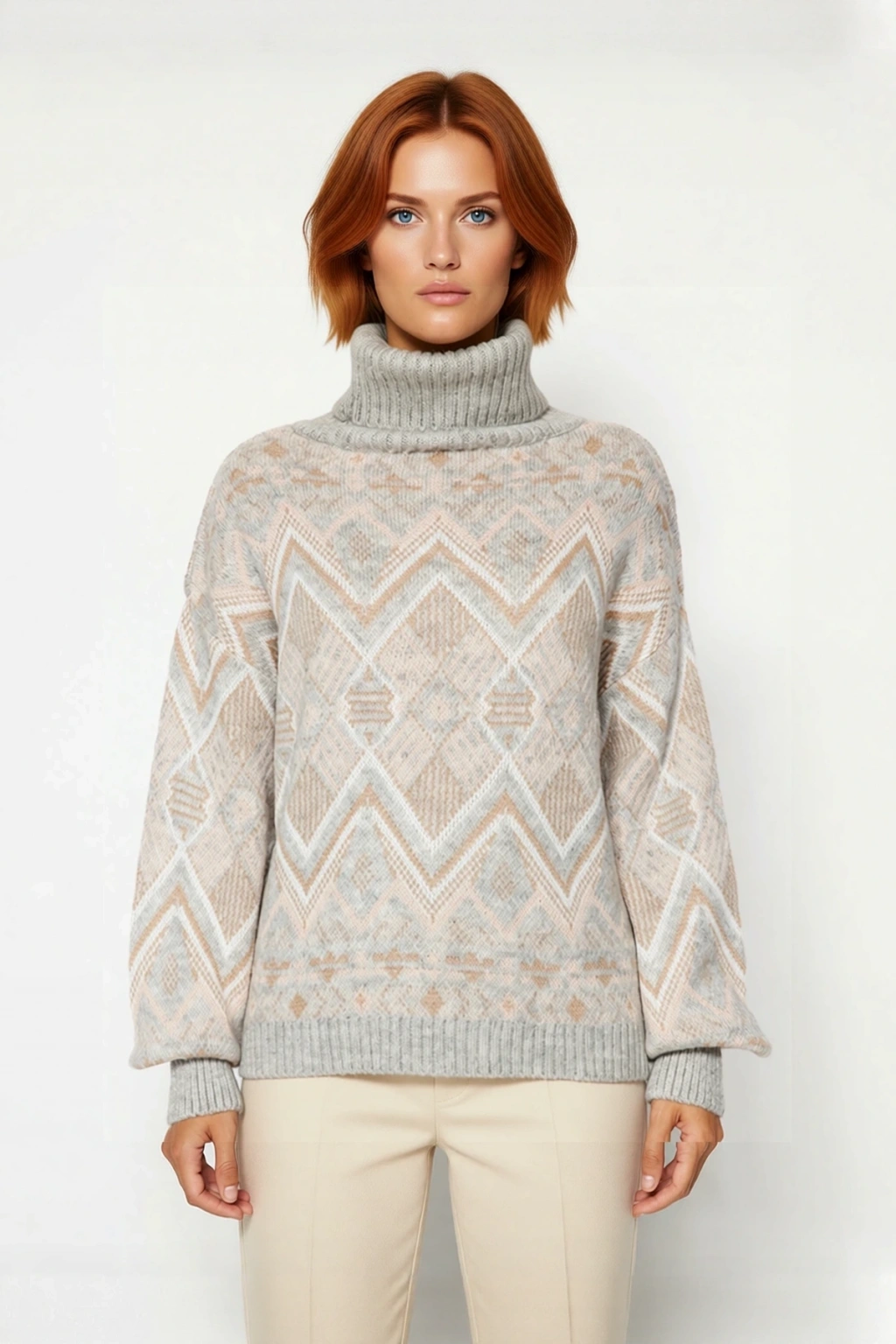 Ürün Özellikleri: Oversize kalıp, akrilik materyal, etnik desen, balıkçı yaka, düşük kol, triko kumaş, gri renk, cepsiz tasarım.