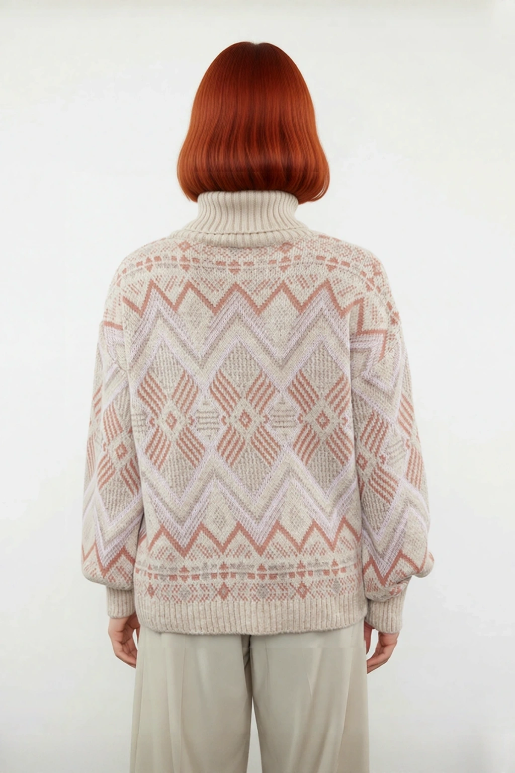 Bu Kadın Oversize Etnik Desenli Balıkçı Yaka Triko Kazak, soğuk kış günlerinde şıklığı ve konforu bir araya getirerek gardırobunuzun vazgeçilmezi olmaya aday. Yumuşacık akrilik materyali sayesinde gün boyu süren sıcaklık ve eşsiz bir rahatlık sunarken, vücuda bolca oturan oversize kalıbı modern ve salaş bir siluet yaratır. Kazak üzerindeki göz alıcı etnik desen, gri, bej ve hafif pembe tonlarıyla zenginleştirilmiş olup, her adımda tarzınıza özgün bir dokunuş katar. Cepsiz tasarımı sade ve akıcı bir görünüm sağlarken, uzun boyu ekstra koruma ve estetik bir duruş sunar. Bu eşsiz parça, "Cool & Comfort" personasına sahip kadınların günlük stilini tamamlamak için idealdir.