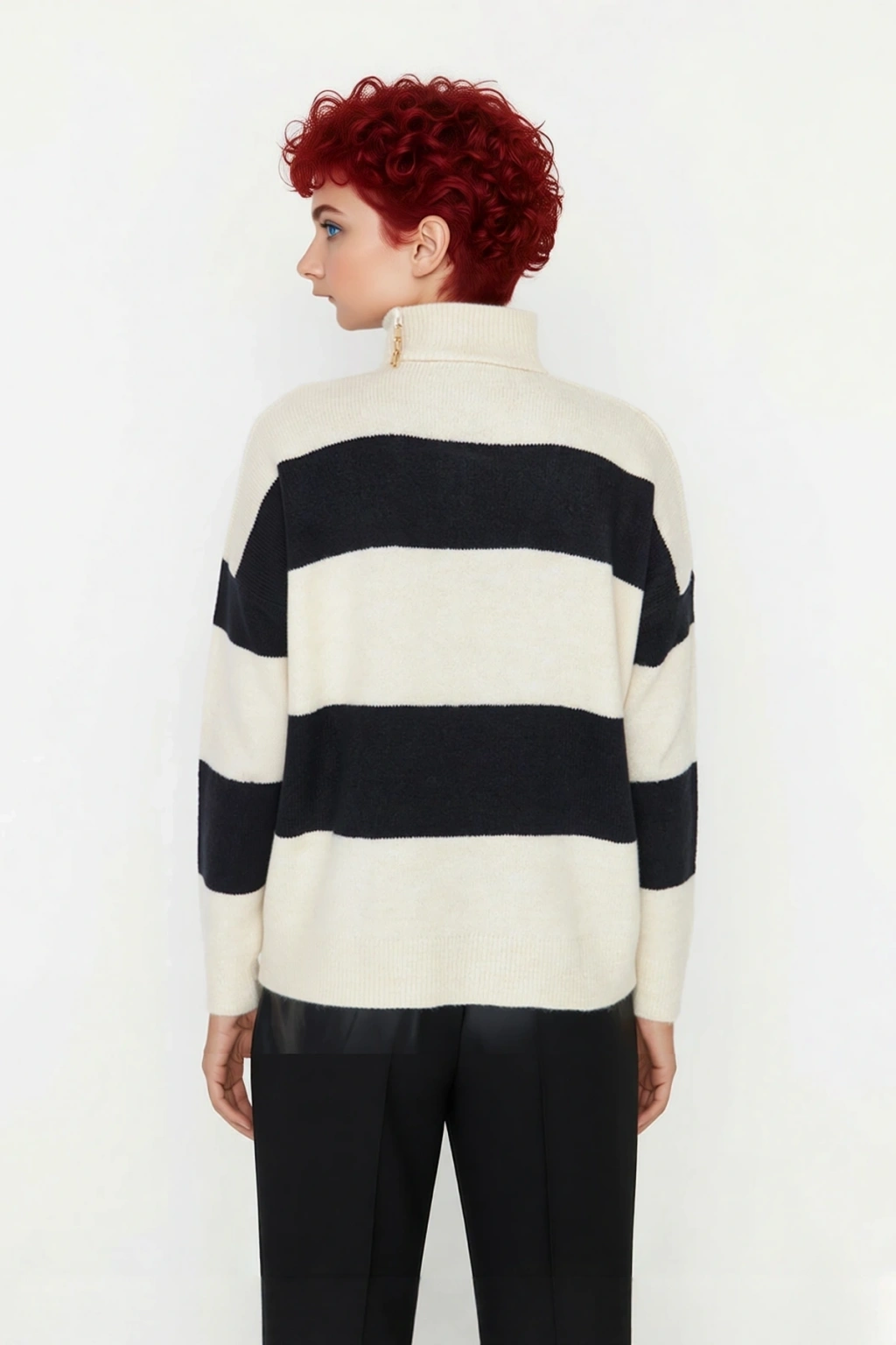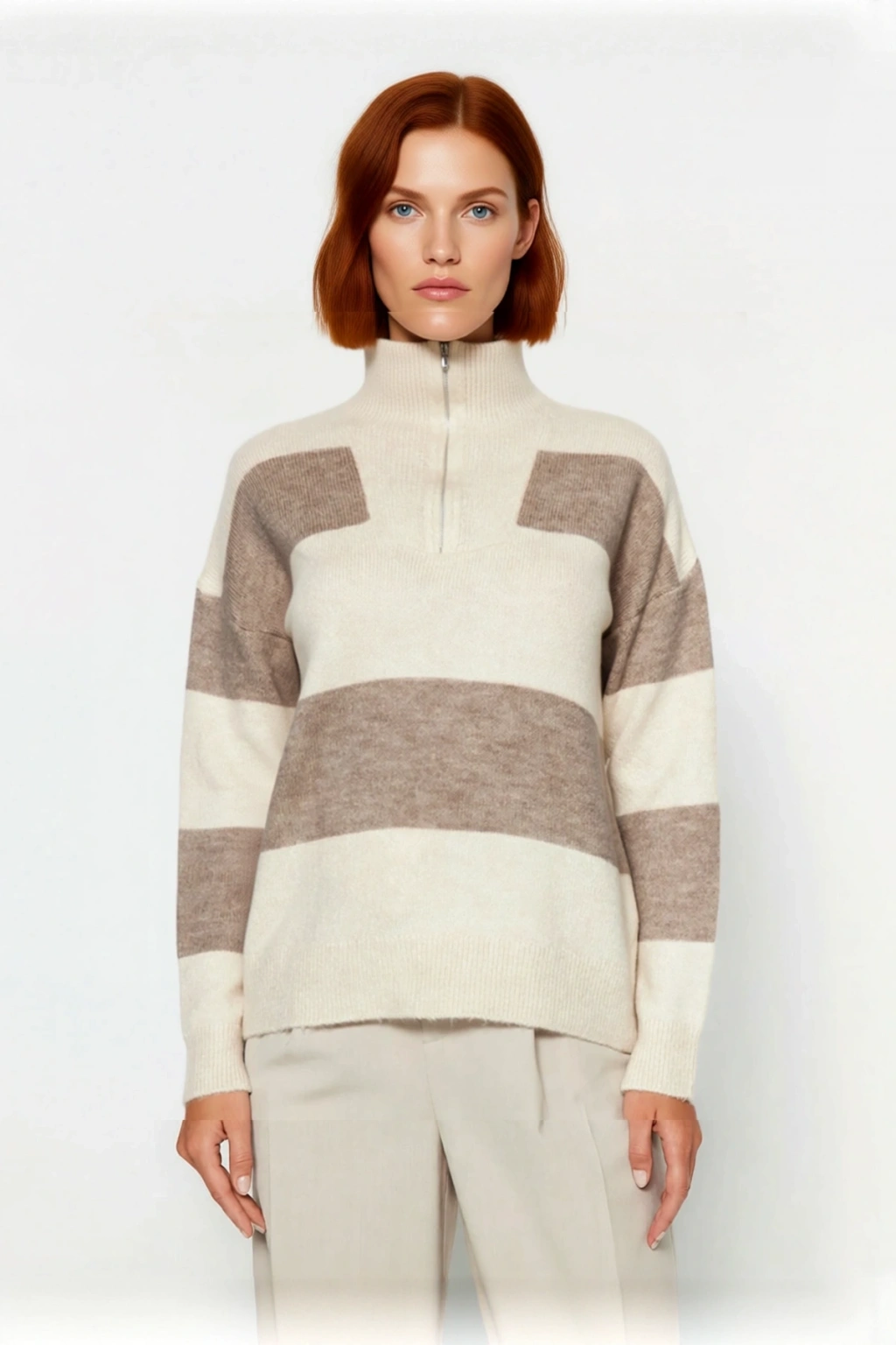Ürün Özellikleri: Oversize kalıp, akrilik polyester elastan materyal, çizgili desen, dik yaka, düşük kol, triko kumaş, bej renk.