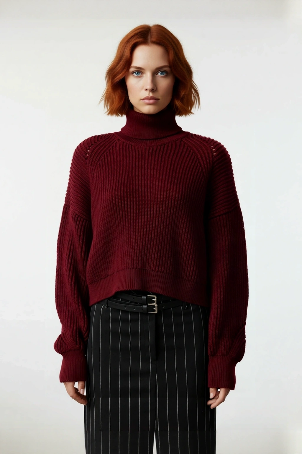 Ürün Özellikleri: Oversize kalıp, %100 akrilik materyal, düz desen, balıkçı yaka, uzun reglan kol, triko kumaş, bordo renk, crop boy, baskısız tasarım, cepsiz, fitilli dokuma, cool & comfort persona, basic siluet, kış sezonu.