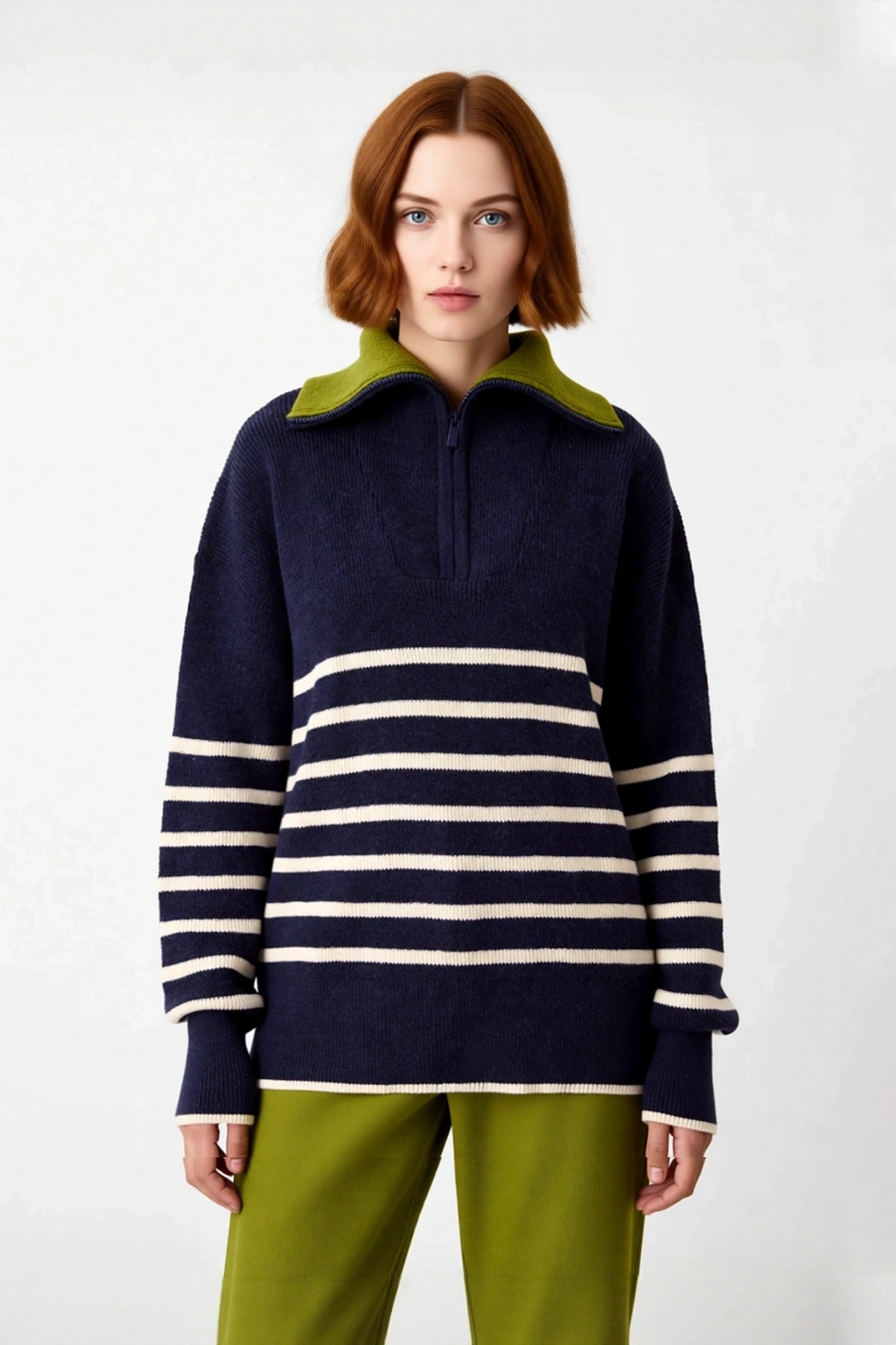 Ürün Özellikleri: Oversize kalıp, akrilik karışımlı materyal, çizgili desen, devrik yaka, düşük kol, triko kumaş, lacivert renk.