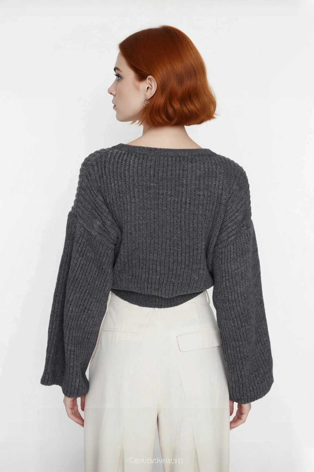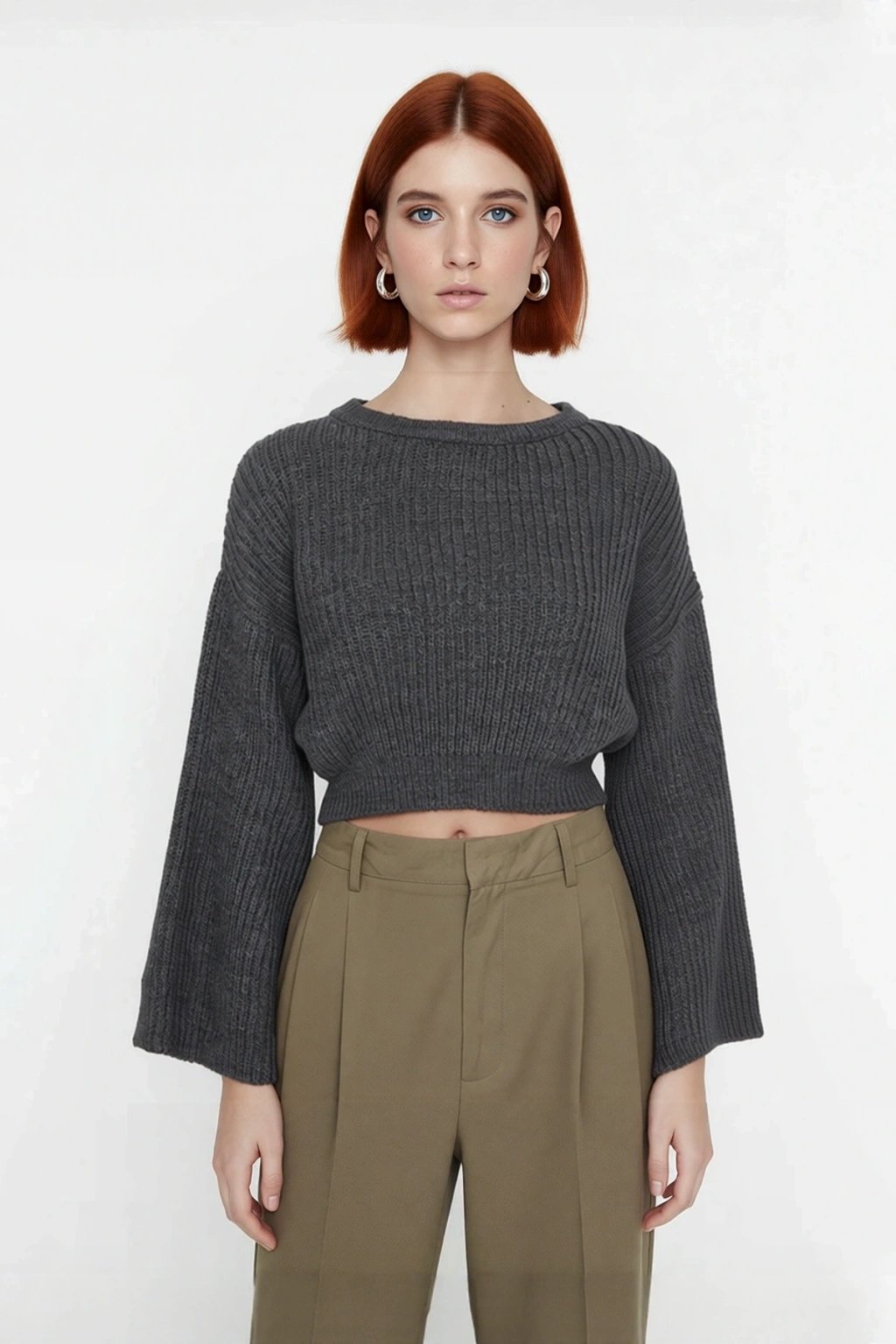 Ürün Özellikleri: Oversize kalıp, %100 akrilik materyal, düz desen, bisiklet yaka, İspanyol kol, triko kumaş, gri renk, baskısız tasarım.