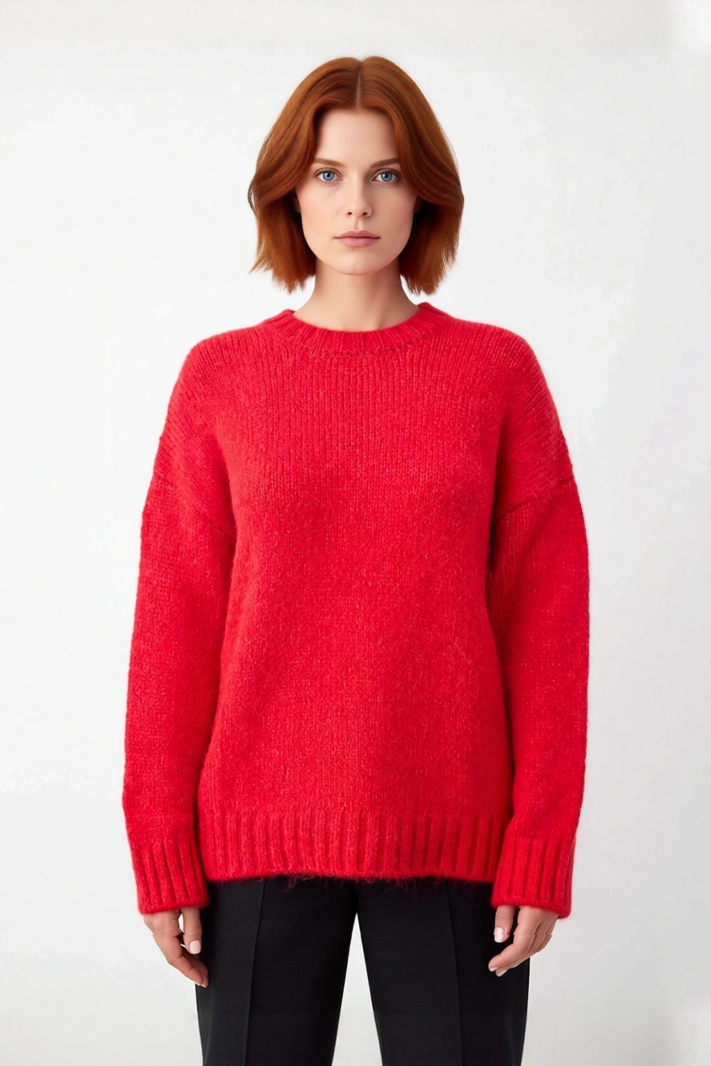 Bisiklet yaka tasarımı klasik bir duruş sergilerken, düşük kol detayı omuzlara düşen rahat bir görünüm sunar ve ceketin altında bile konforlu bir kullanım sağlar. Tek plaka dokuma tipi, ürünün kalitesini ve sağlamlığını artırırken, uzun kol boyu bileklerinizi de sararak ekstra sıcaklık sunar. Kalın kumaş yapısı kış aylarının zorlu koşullarına karşı ideal bir koruma sağlarken, triko dokusu cildinizin nefes almasına olanak tanır. T41 yıkama talimatına uygunluğu sayesinde bakımı oldukça pratiktir, böylece bu özel triko uzun süre ilk günkü formunu ve rengini korur. Bu kazak, modern kadının dinamik yaşamına uyum sağlamak üzere tasarlanmıştır, hem şık hem de fonksiyoneldir.
