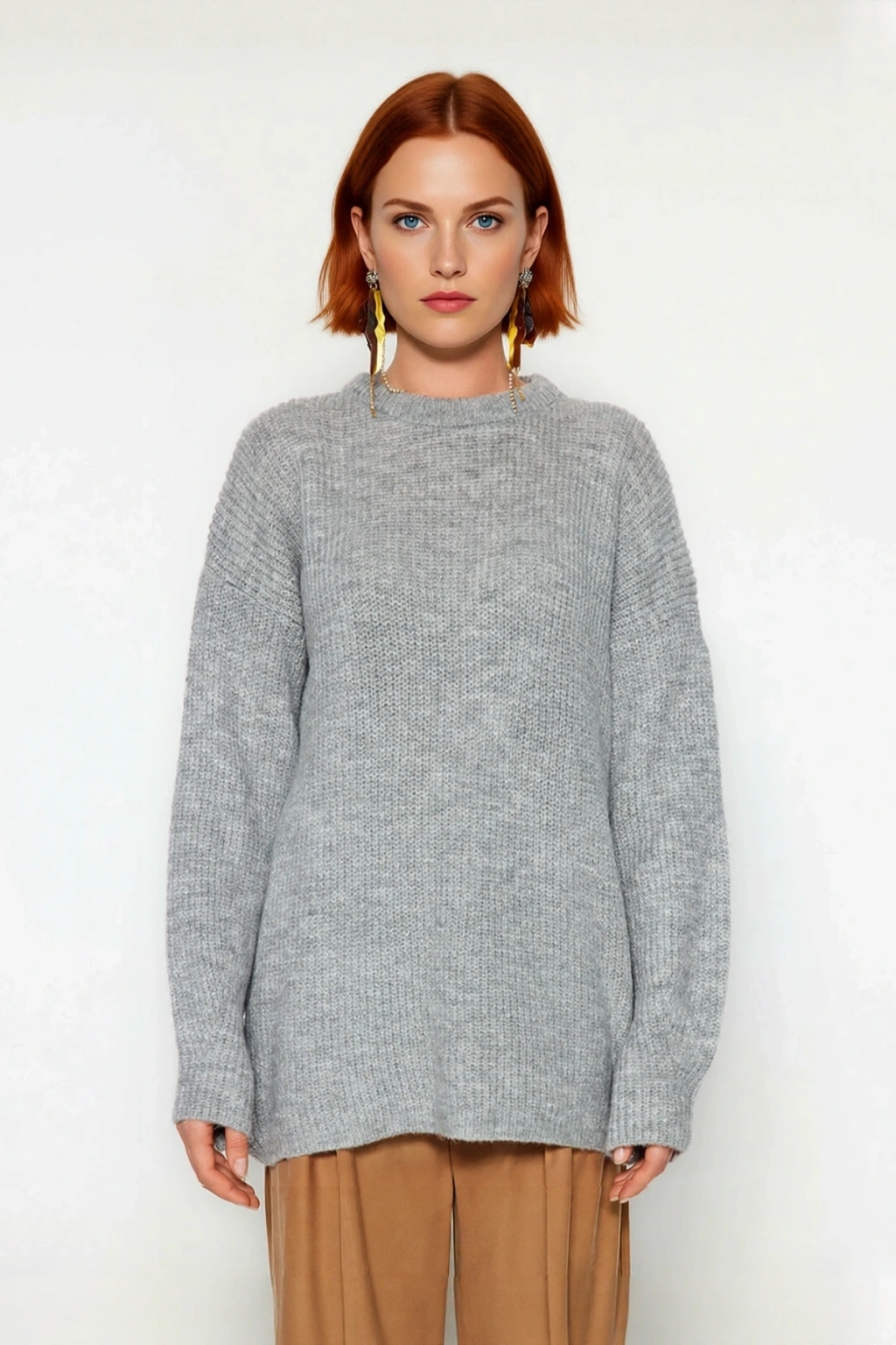 Ürün Özellikleri: Oversize kalıp, akrilik materyal, düz desen, bisiklet yaka, düşük kol, triko kumaş, gri renk, baskısız tasarım.