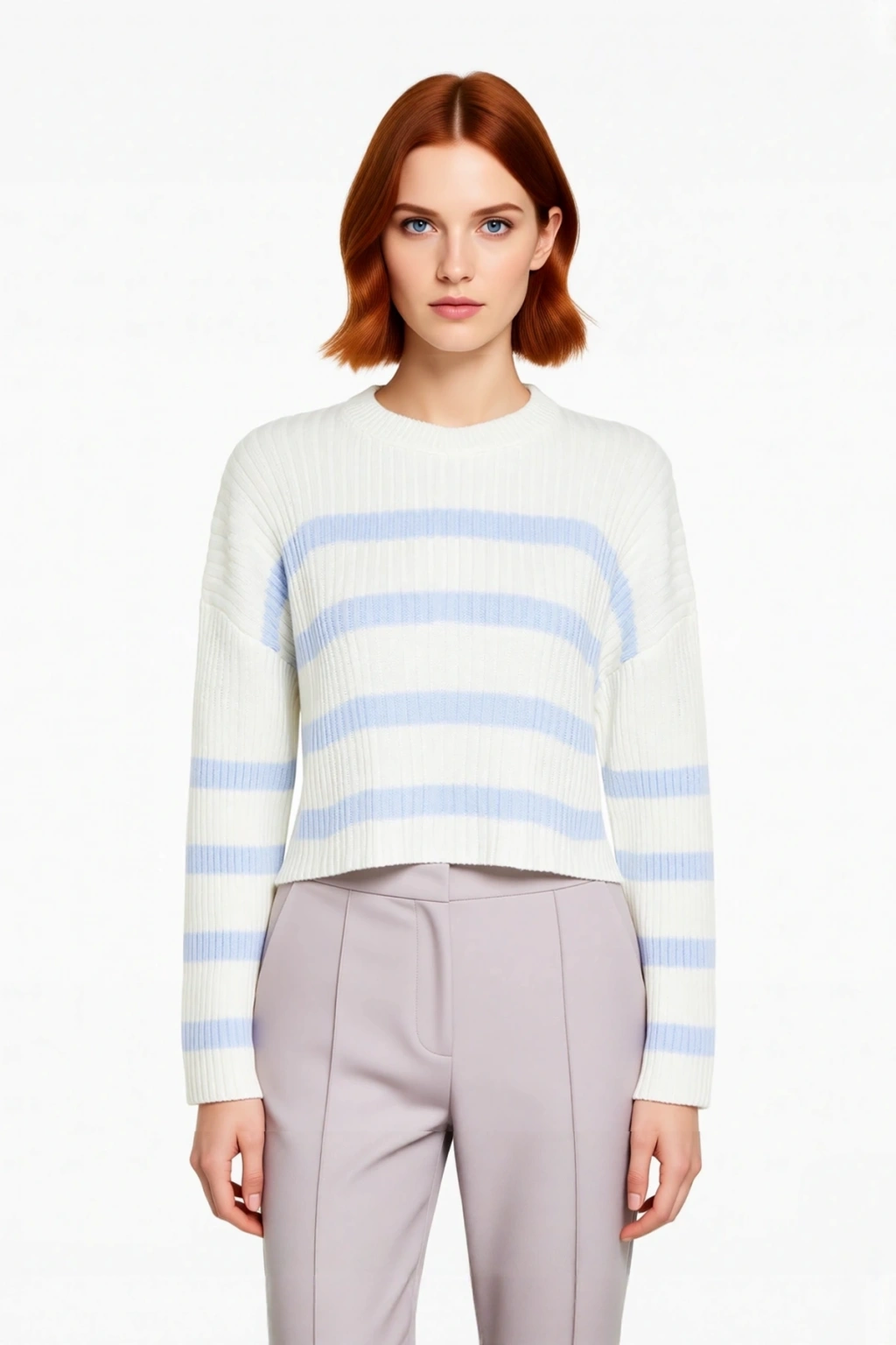 Ürün Özellikleri: Oversize kalıp, akrilik materyal, çizgili desen, bisiklet yaka, düşük kol, triko kumaş, gri renk.