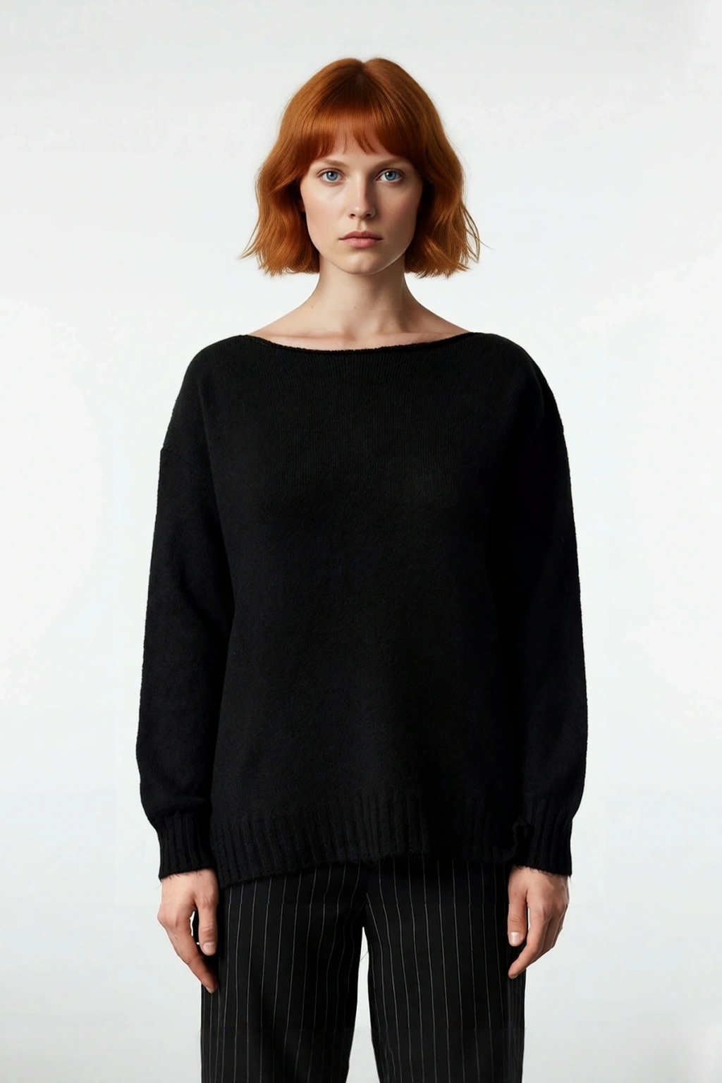 Ürün Özellikleri: Oversize kalıp, akrilik polyester yün materyal, düz desen, kayık yaka, standart kol, triko kumaş, lacivert renk, ince kalınlık.