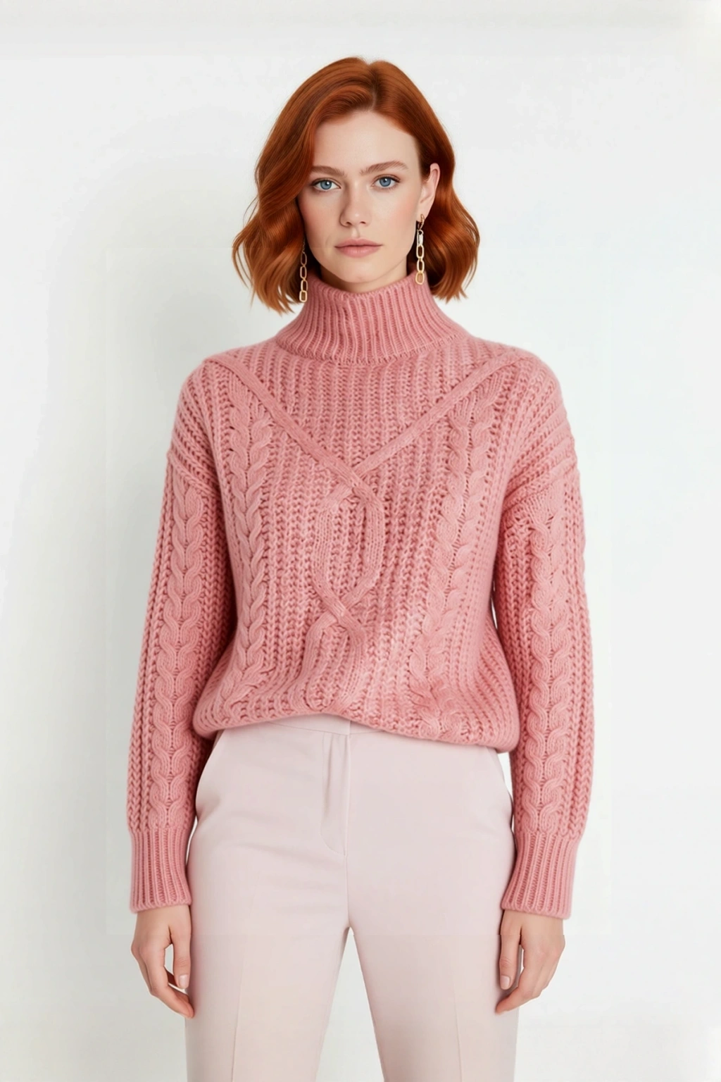 Ürün Özellikleri: Oversize kalıp, akrilik materyal, saç örgü desen, dik yaka, düşük kol, triko kumaş, pembe renk.
