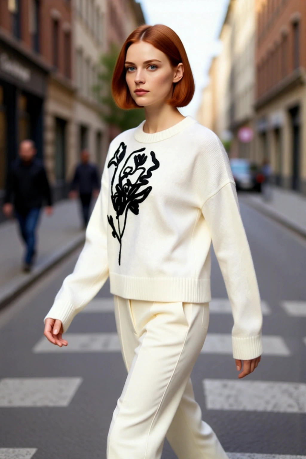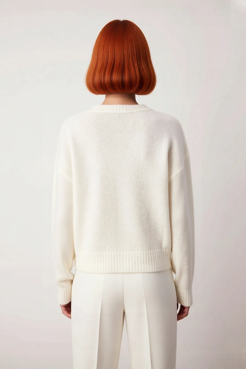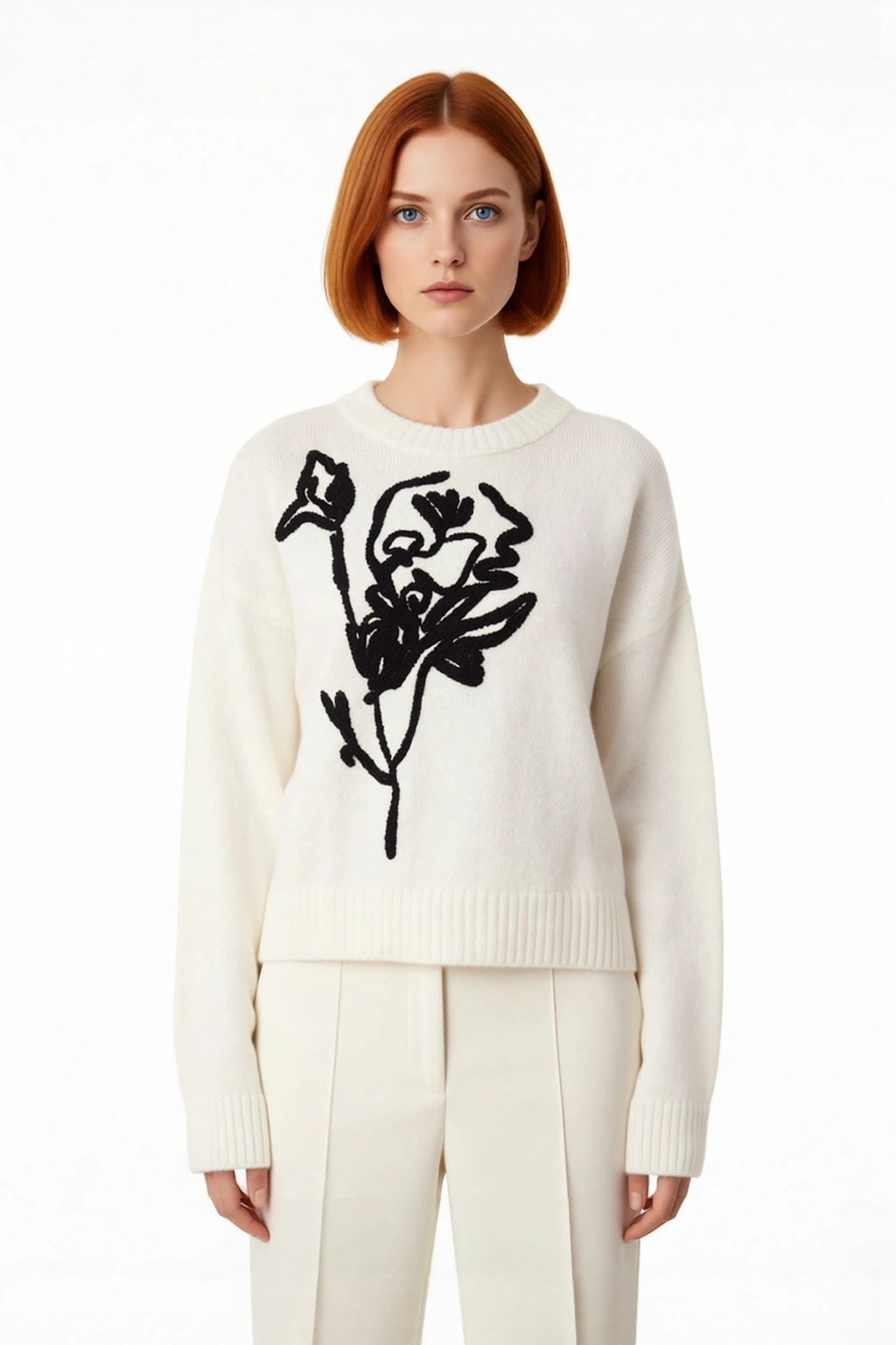 Ürün Özellikleri: Oversize kalıp, 75% akrilik 25% polyester materyal, nakışlı / işlemeli desen, bisiklet yaka, düşük kol, triko kumaş, ekru renk, orta kalınlık, casual/günlük ortam, cool & comfort persona.