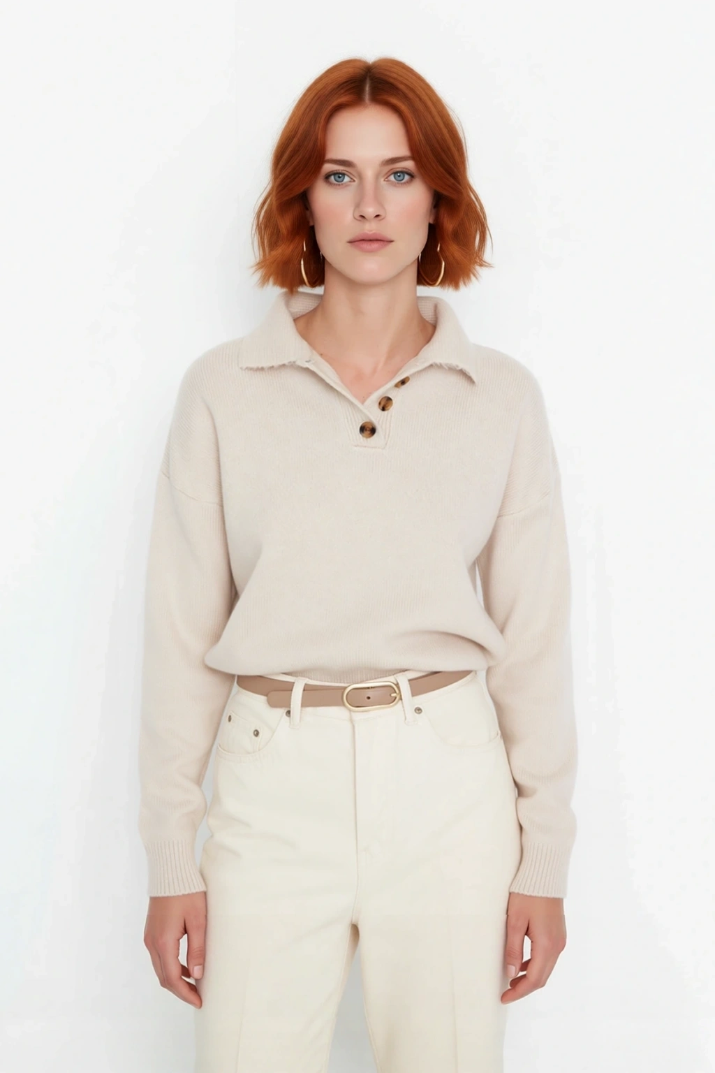 Ürün Özellikleri: Oversize kalıp, 80% akrilik 20% polyester materyal, düz desen, polo yaka, düşük kol, triko kumaş, bej renk.