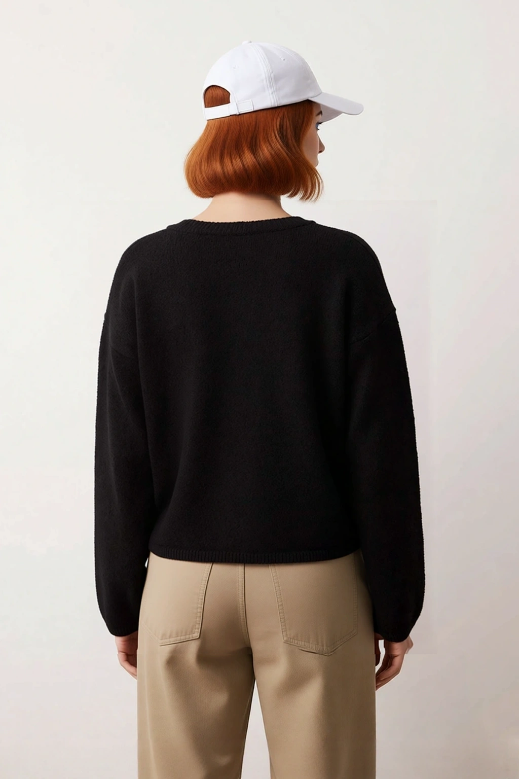 Kadınlar için tasarlanmış bu oversize rahat kesim triko kazak, konfor ve şıklığı bir araya getirir. Düz desenli siyah rengi, her türlü kıyafetle uyum sağlayarak çok yönlü bir kullanım sunar. %50 pamuk ve %50 polyesterden oluşan materyal bileşeni, hem yumuşak bir dokunuş hem de dayanıklı bir yapı sunar. Düşük kol ve uzun kol boyu detayları, rahat bir siluet oluştururken, orta kalınlıktaki triko kumaşı soğuk kış günlerinde ideal bir sıcaklık sağlar. Cool ve comfort persona'sını benimseyen kadınlar için mükemmel bir seçimdir.