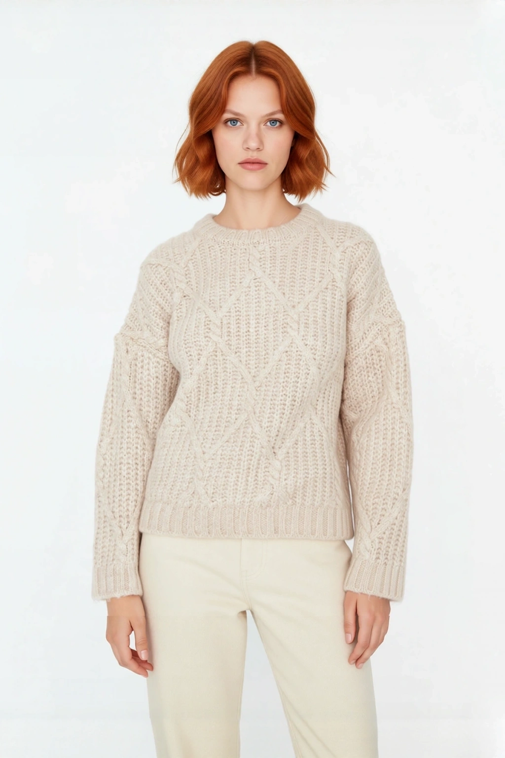 Ürün Özellikleri: Oversize kalıp, akrilik polyester materyal, saç örgü desen, bisiklet yaka, standart kol, triko kumaş, gri renk, kemersiz tasarım.