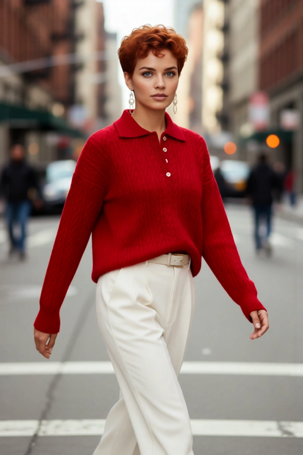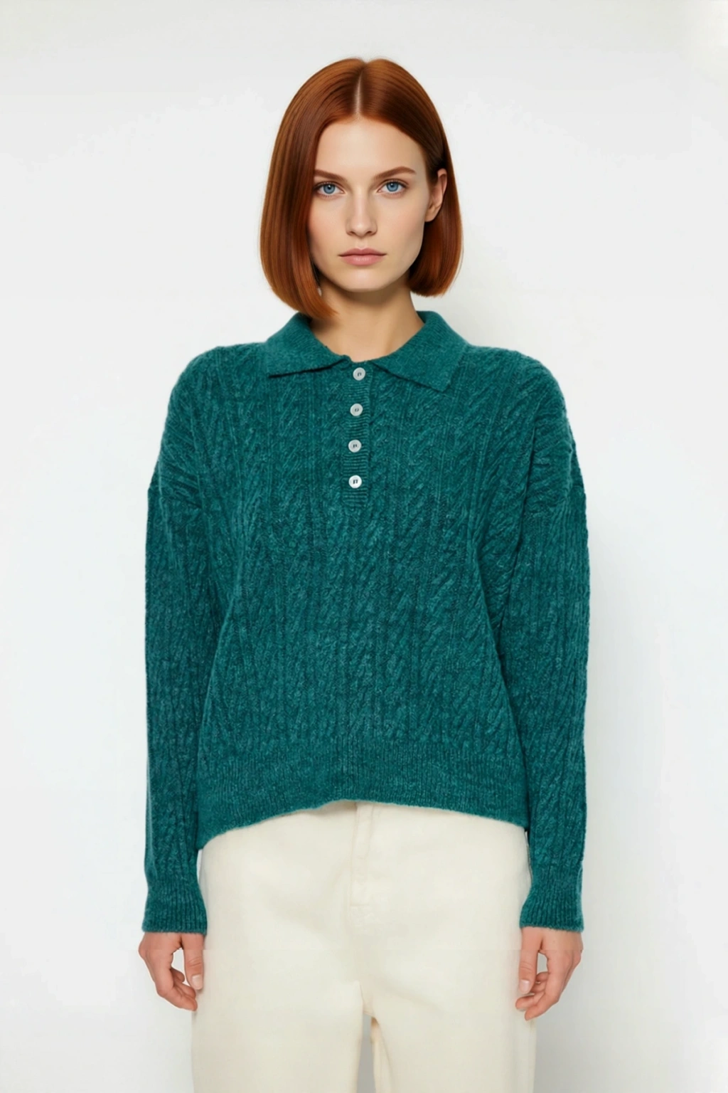 Polo yaka tasarımı, kazağa şık ve sportif bir hava katarken, düğmeli yapısıyla kullanım kolaylığı sağlar. Düşük kol ve uzun kol boyu, hareket özgürlüğü sunar ve rahat bir giyim deneyimi vaat eder. Orta kalınlıktaki triko kumaş tipi, çift plaka dokuma tekniğiyle üretilerek ekstra dayanıklılık ve sıcaklık sunar. Cepsiz tasarımı sade ve minimalist bir görünüm sağlarken, kemersiz yapısı farklı aksesuar kullanımlarına imkan tanır. Yüksek kaliteli materyali sayesinde uzun ömürlü kullanım sunar ve makinede kolayca yıkanabilir özelliğiyle pratik bir bakım sağlar. Cool & Comfort personasını yansıtan bu kazak, stil ve konforu bir arada arayan kadınlar için idealdir.