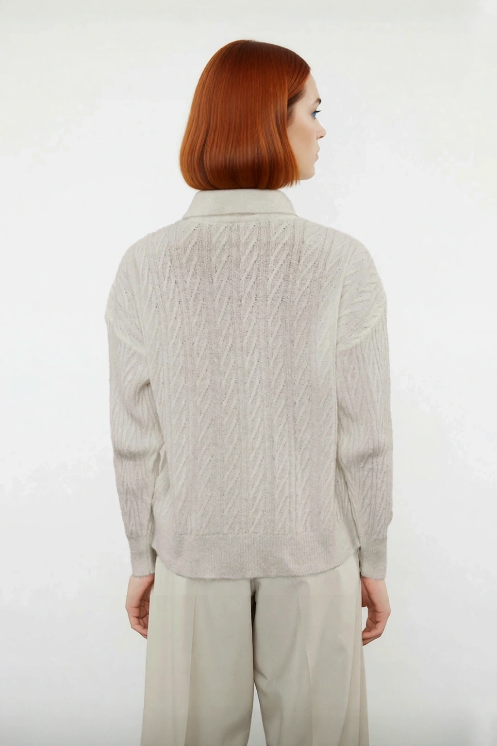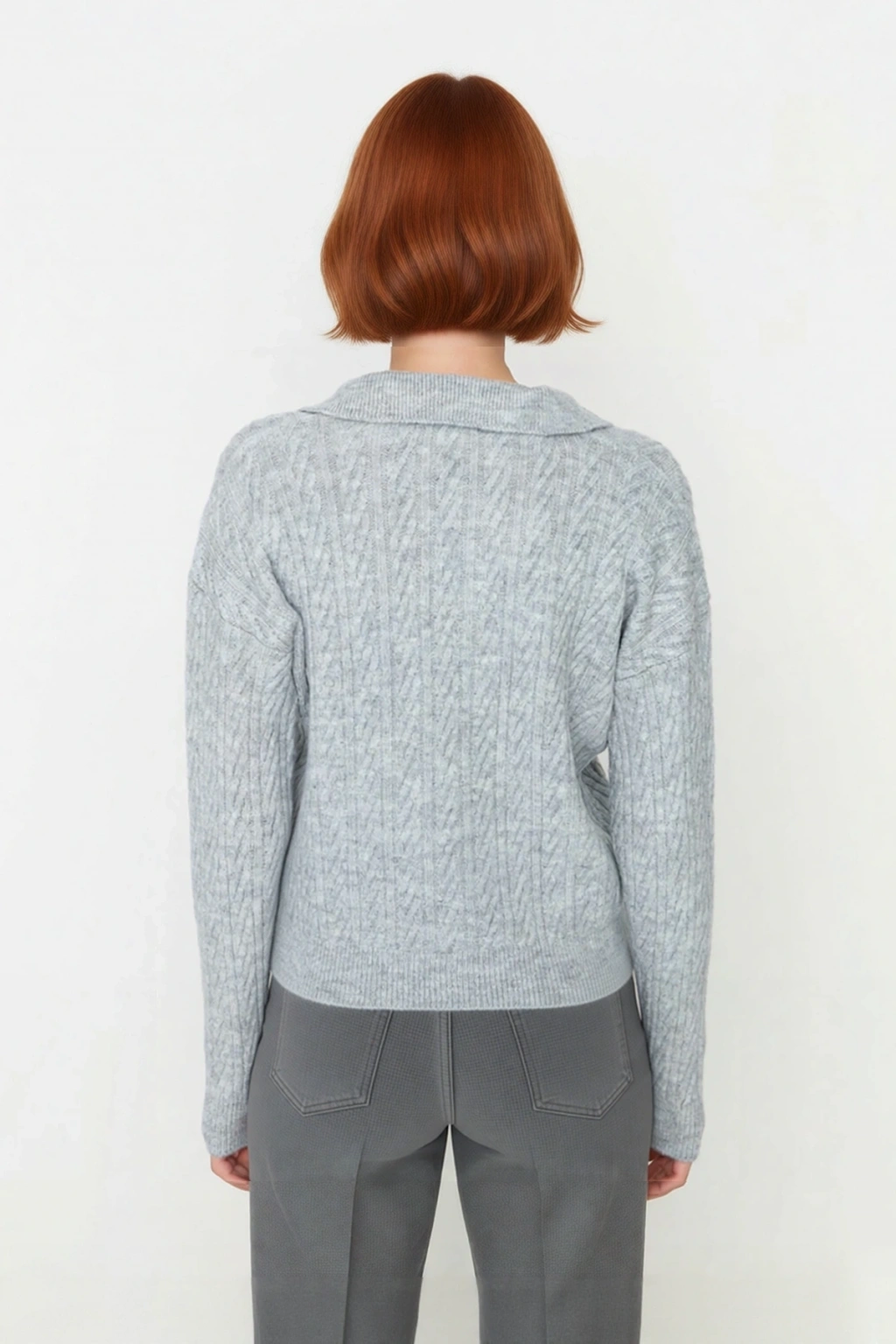 Ürün Özellikleri: Oversize kalıp, 74% akrilik 26% polyester materyal, saç örgü desen, polo yaka, düşük uzun kol, triko kumaş, gri renk, basic siluet.