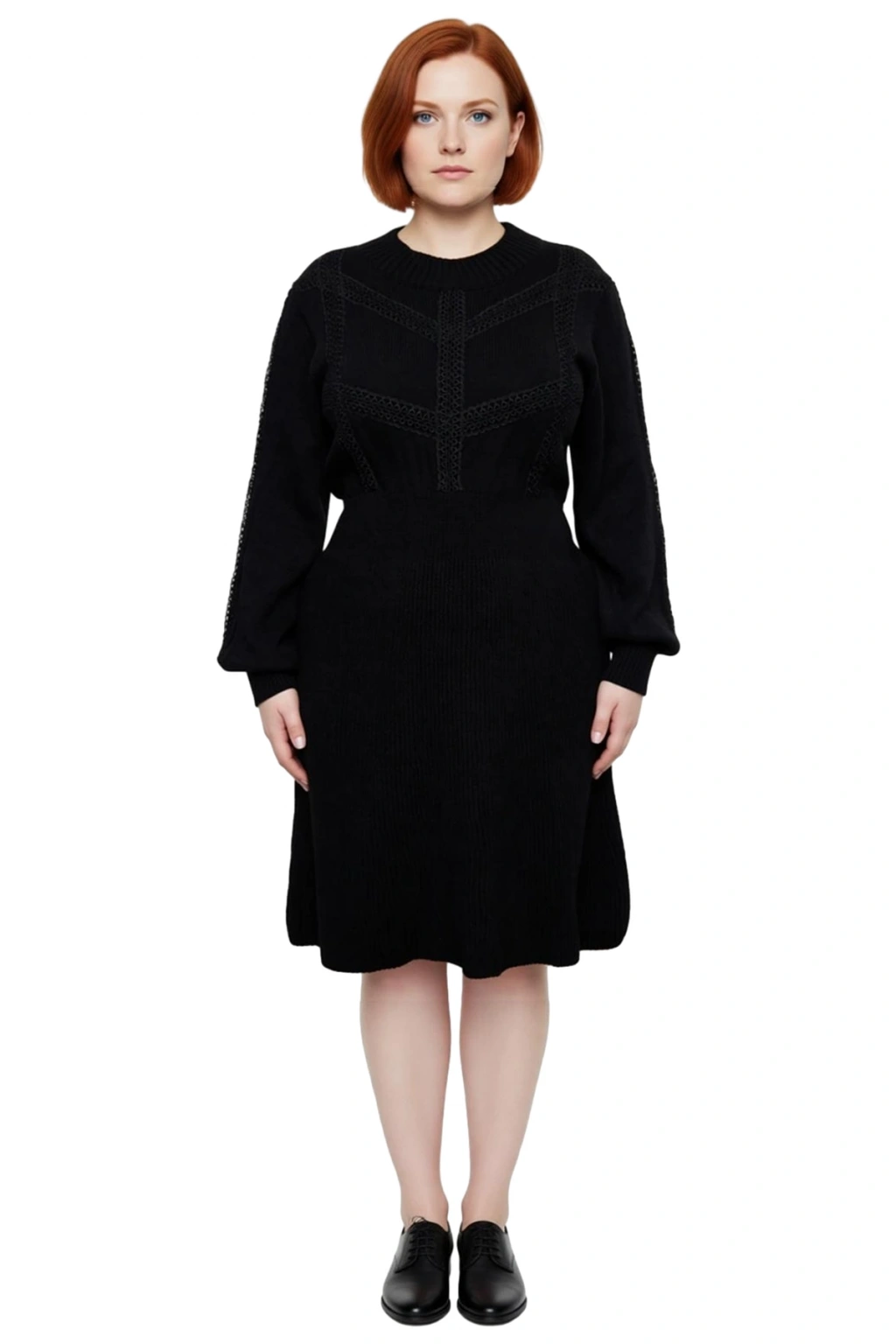 Bu modern kadın triko elbise, oversize kalıbıyla rahatlığı ve şıklığı bir araya getirir. Akrilik materyalden üretilen bu parça, kış aylarının soğuk günlerinde sizi sıcak tutarken, yumuşak dokusuyla gün boyu konfor sunar. Skater silueti, midi boyuyla genç ve enerjik bir hava katarken, aynı zamanda zarif bir görünüm sağlar. Siyah rengi, her gardıropla uyum sağlayarak kolay kombin imkanı sunar. Elbisenin yaka ve kol bölgelerindeki özel örgü detayları, düz tasarıma hareket katıp ürünü sıradanlıktan uzaklaştırır.
